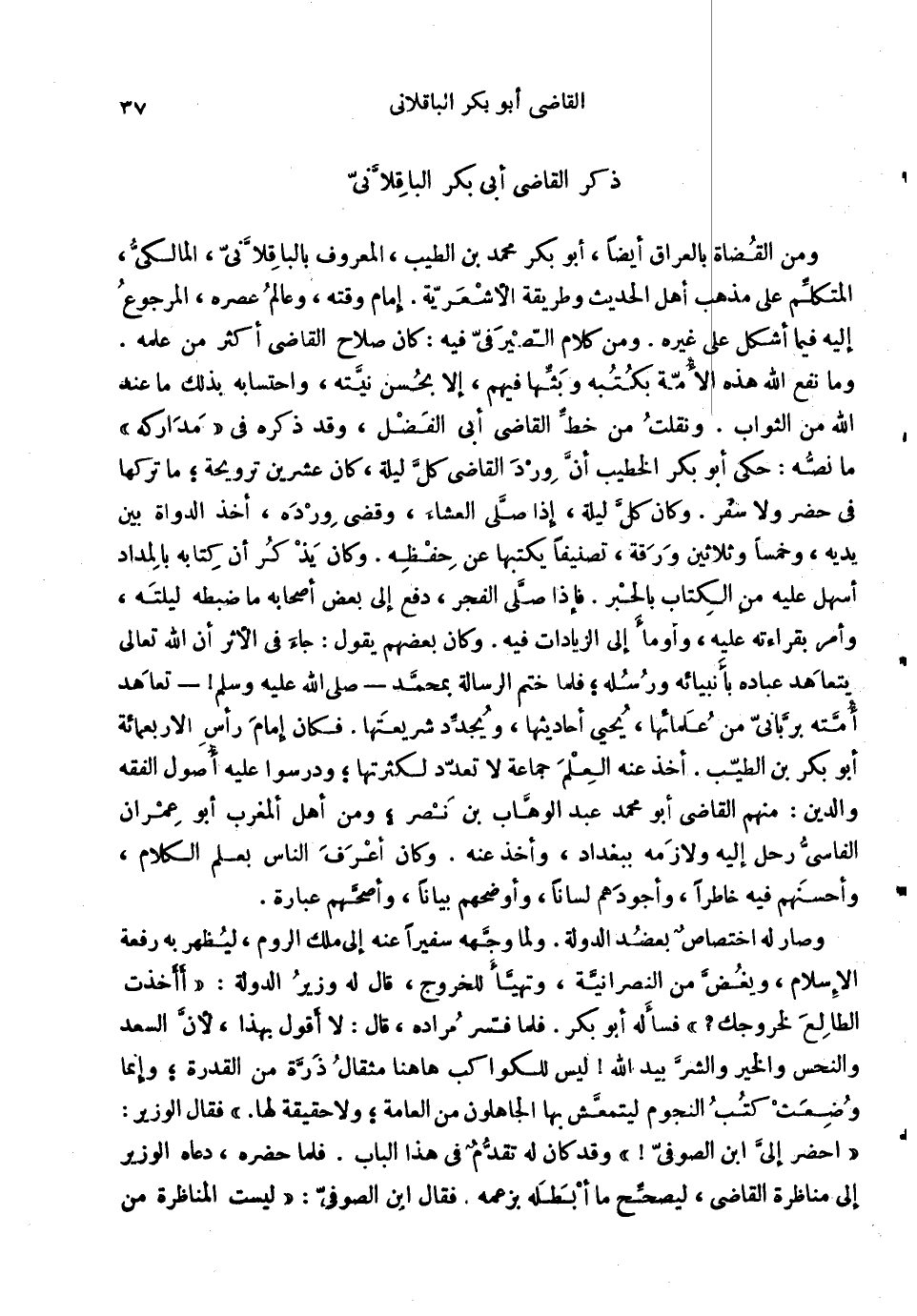 وَمن الْقُضَاة بالعراق أَيْضا، أَبُو بكر مُحَمَّد بن الطّيب، الْمَعْرُوف بالباقلاني، الْمَالِكِي، الْمُتَكَلّم على مَذْهَب أهل الحَدِيث وَطَرِيقَة الأشعرية. إِمَام وقته، وعالم عصره، المرجوع إِلَيْهِ فِيمَا أشكل على غَيره. وَمن كَلَام الصَّيْرَفِي فِيهِ: كَانَ صَلَاح القَاضِي أَكثر من علمه. وَمَا نفع الله هَذِه الْأمة بكتبه وبثها فيهم، إِلَّا بِحسن نِيَّته، واحتسابه بذلك مَا عِنْد الله من الثَّوَاب. ونقلت من خطّ القَاضِي أبي الْفضل، وَقد ذكره فِي مداركه مَا نَصه: حكى أَبُو بكر الْخَطِيب أَن ورد القَاضِي كل لَيْلَة، كَانَ عشْرين ترويحة؛ مَا تَركهَا فِي حضر وَلَا سفر. وَكَانَ كل لَيْلَة، إِذا صلى الْعشَاء، وَقضى ورده، أَخذ الدواة بَين يَدَيْهِ، وخمساً وَثَلَاثِينَ ورقة، تصنيفاً يَكْتُبهَا عَن حفظه. وَكَانَ يذكر أَن كِتَابه بالمداد أسهل عَلَيْهِ من الْكتاب بالحبر. فَإِذا صلى الْفجْر، دفع إِلَى بعض أَصْحَابه مَا ضَبطه ليلته، وَأمر بقرَاءَته عَلَيْهِ، وَأَوْمَأَ إِلَى الزِّيَادَات فِيهِ. وَكَانَ بَعضهم يَقُول: جَاءَ فِي الْأَثر إِن الله تَعَالَى يتَعَاهَد عباده بأنبيائه وَرُسُله؛ فَلَمَّا ختم الرسَالَة بِمُحَمد صلى الله عَلَيْهِ وَسلم {تعاهد أمته برباني من علمائها، يحيي أحاديثها، ويجدد شريعتها. فَكَانَ إِمَام رَأس الأربعمائة أَبُو بكر بن الطّيب. أَخذ عَنهُ الْعلم جمَاعَة لَا تعد لكثرتها؛ ودرسوا عَلَيْهِ أصُول الْفِقْه وَالدّين: مِنْهُم القَاضِي أَبُو مُحَمَّد عبد الْوَهَّاب بن نصر؛ وَمن أهل الْمغرب أَبُو عمرَان الفاسي رَحل إِلَيْهِ ولازمه بِبَغْدَاد، وَأخذ عَنهُ. وَكَانَ أعرف النَّاس بِعلم الْكَلَام، وَأَحْسَنهمْ فِيهِ خاطراً، وأجودهم لِسَانا، وأوضحهم بَيَانا، وأصحهم عبارَة. وَصَارَ لَهُ اخْتِصَاص بعضد الدولة. وَلما وَجهه سفيراً عَنهُ إِلَى ملك الرّوم، ليظْهر بِهِ رفْعَة الْإِسْلَام، ويغض من النَّصْرَانِيَّة، وتهيأ لِلْخُرُوجِ، قَالَ لَهُ وَزِير الدولة: أاخذت الطالع لخروجك؟ فَسَأَلَهُ أَبُو بكر. فَلَمَّا فسر مُرَاده، قَالَ: لَا أَقُول بِهَذَا، لِأَن السعد والنحس وَالْخَيْر وَالشَّر بيد الله} لَيْسَ للكواكب هَا هُنَا مِثْقَال ذرة من الْقُدْرَة؛ وَإِنَّمَا وضعت كتب النُّجُوم ليتمعش بهَا الجاهلون من الْعَامَّة؛ وَلَا حَقِيقَة لَهَا. فَقَالَ الْوَزير: احضر إِلَى ابْن الصُّوفِي! وَقد كَانَ لَهُ تقدم فِي هَذَا الْبَاب. فَلَمَّا حَضَره، دَعَاهُ الْوَزير إِلَى مناظرة القَاضِي، ليصحح مَا أبْطلهُ بِزَعْمِهِ فَقَالَ ابْن الصُّوفِي: لَيست المناظرة من