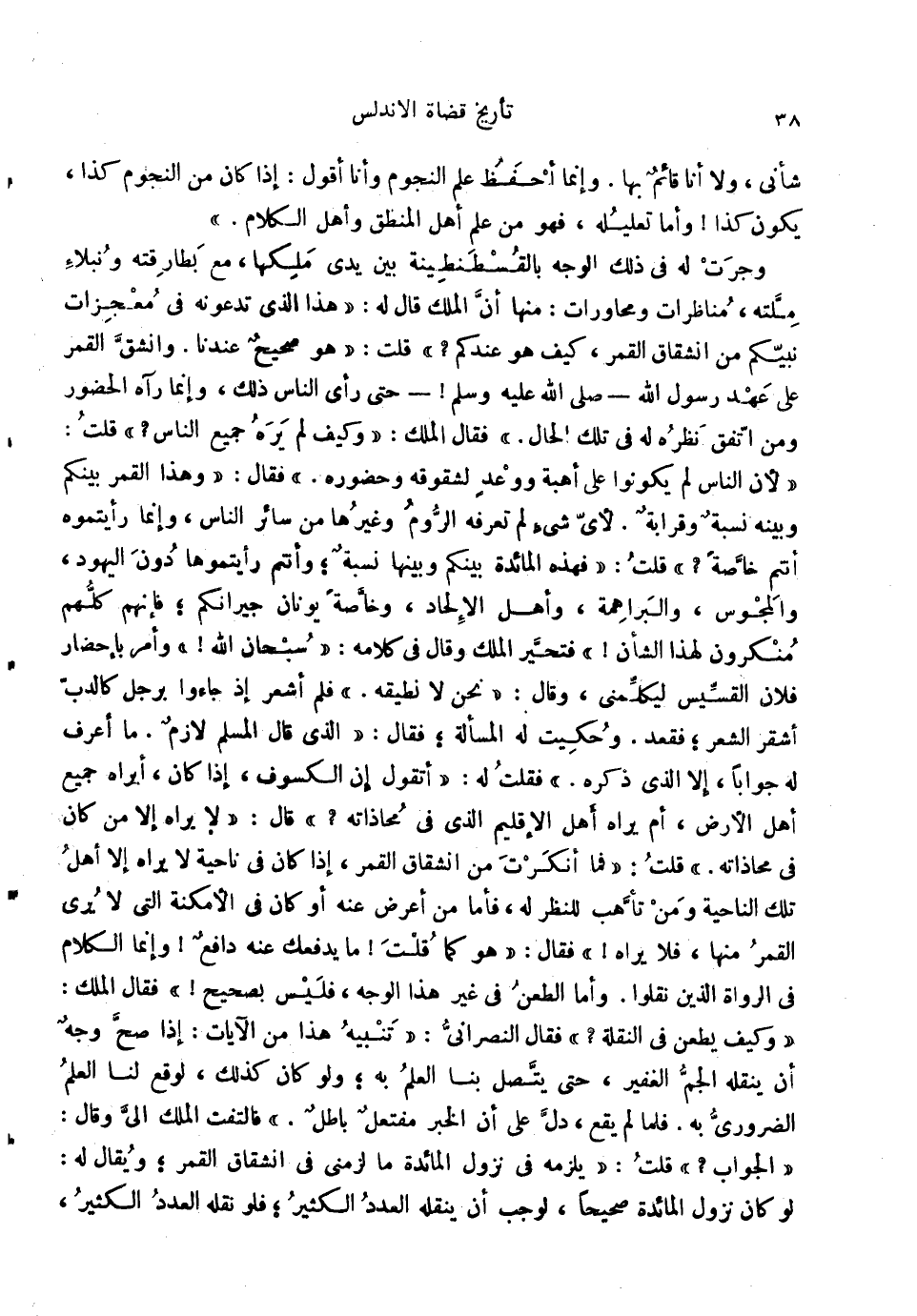 شأني، وَلَا أَنا قَائِم بهَا. وَإِنَّمَا أحفظ علم النُّجُوم وَأَنا أَقُول: إِذا كَانَ من النُّجُوم كَذَا، يكون كَذَا {وَأما تَعْلِيله، فَهُوَ من علم أهل الْمنطق وَأهل الْكَلَام. وَجَرت لَهُ فِي ذَلِك الْوَجْه بِالْقُسْطَنْطِينِيَّةِ بَين يَدي ملكهَا، مَعَ بطارقته ونبلاء مِلَّته، مناظرات ومحاورات: مِنْهَا أَن الْملك قَالَ لَهُ: هَذَا الَّذِي تَدعُونَهُ فِي معجزات نَبِيكُم من انْشِقَاق الْقَمَر، كَيفَ هُوَ عنْدكُمْ؟ قلت: هُوَ صَحِيح عندنَا. وَانْشَقَّ الْقَمَر على عهد رَسُول الله صلى الله عَلَيْهِ وَسلم} حَتَّى رأى النَّاس ذَلِك، وَإِنَّمَا رَآهُ الْحُضُور وَمن اتّفق نظره لَهُ فِي تِلْكَ الْحَال. فَقَالَ الْملك: وَكَيف لم يره جَمِيع النَّاس؟ قلت: لِأَن النَّاس لم يَكُونُوا على أهبة ووعد لشقوقه وحضوره. فَقَالَ: وَهَذَا الْقَمَر بَيْنكُم وَبَينه نِسْبَة وقرابة. لأي شَيْء لم تعرفه الرّوم وَغَيرهَا من سَائِر النَّاس، وَإِنَّمَا رَأَيْتُمُوهُ أَنْتُم خَاصَّة؟ قلت: فَهَذِهِ الْمَائِدَة بَيْنكُم وَبَينهَا نِسْبَة؛ وَأَنْتُم رأيتموها دون الْيَهُود، وَالْمَجُوس، والبراهمة، وَأهل الْإِلْحَاد، وخاصة يونان جِيرَانكُمْ؛ فَإِنَّهُم كلهم منكرون لهَذَا الشَّأْن {فتحير الْملك وَقَالَ فِي كَلَامه: سُبْحَانَ الله} وَأمر بإحضار فلَان القسيس ليكلمني، وَقَالَ: نَحن لَا نطيقه. فَلم أشعر إِذْ جَاءُوا بِرَجُل كالدب أشقر الشّعْر؛ فَقعدَ. وحكيت لَهُ الْمَسْأَلَة؛ فَقَالَ: الَّذِي قَالَ الْمُسلم لَازم. مَا أعرف لَهُ جَوَابا، إِلَّا الَّذِي ذكره. فَقلت لَهُ: أَتَقول إِن الْكُسُوف، إِذا كَانَ، أيراه جَمِيع أهل الأَرْض، أم يرَاهُ أهل الإقليم الَّذِي فِي محاذاته؟ قَالَ: لَا يرَاهُ إِلَّا من كَانَ فِي محاذاته. قلت: فَمَا أنْكرت من انْشِقَاق الْقَمَر، إِذا كَانَ فِي نَاحيَة لَا يرَاهُ إِلَّا أهل تِلْكَ النَّاحِيَة وَمن تأهب للنَّظَر لَهُ، فَأَما من أعرض عَنهُ أَو كَانَ فِي الْأَمْكِنَة الَّتِي لَا يرى الْقَمَر مِنْهَا، فَلَا يرَاهُ {فَقَالَ: هُوَ كَمَا قلت} مَا يدفعك عَنهُ دَافع {وَإِنَّمَا الْكَلَام فِي الروَاة الَّذين نقلوا. وَأما الطعْن فِي غير هَذَا الْوَجْه، فَلَيْسَ بِصَحِيح} فَقَالَ الْملك: وَكَيف يطعن فِي النقلَة؟ فَقَالَ النَّصْرَانِي: تَنْبِيه هَذَا من الْآيَات: إِذا صَحَّ وَجه أَن يَنْقُلهُ الجم الْغَفِير، حَتَّى يتَّصل بِنَا الْعلم بِهِ، وَلَو كَانَ كَذَلِك، لوقع لنا الْعلم الضَّرُورِيّ بِهِ. فَلَمَّا لم يَقع، دلّ على أَن الْخَبَر مفتعل بَاطِل. فَالْتَفت الْملك إِلَيّ وَقَالَ: الْجَواب؟ قلت: يلْزمه فِي نزُول الْمَائِدَة مَا لزمني فِي انْشِقَاق الْقَمَر؛ وَيُقَال لَهُ: لَو كَانَ نزُول الْمَائِدَة صَحِيحا، لوَجَبَ أَن يَنْقُلهُ الْعدَد الْكثير؛ فَلَو نَقله الْعدَد الْكثير،