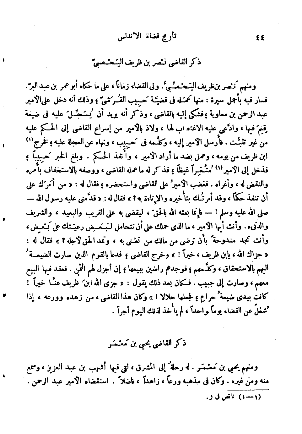 وَمِنْهُم نصر بن ظريف الْيحصبِي. ولي الْقَضَاء زَمَانا، على مَا حَكَاهُ أَبُو عمر بن عبد الْبر. فَسَار فِيهِ بأجمل سيرة: مِنْهَا عمله فِي قَضِيَّة حبيب الْقرشِي؛ وَذَلِكَ أَنه دخل على الْأَمِير عبد الرَّحْمَن بن مُعَاوِيَة؛ فَشكى إِلَيْهِ بِالْقَاضِي، وَذكر أَنه يُرِيد أَن يسجل عَلَيْهِ فِي ضَيْعَة قيم فِيهَا، وَادّعى عَلَيْهِ الاغتصاب لَهَا، ولاذ بالأمير من إسراع القَاضِي إِلَى الحكم عَلَيْهِ من غير تثبيت. فَأرْسل الْأَمِير إِلَيْهِ، وَكَلمه فِي حبيب، وَنَهَاهُ عَن العجلة عَلَيْهِ؛ فَخرج ابْن ظريف من يَوْمه، وَعمل بضد مَا أَرَادَ الْأَمِير، وأنفذ الحكم. وَبلغ الْخَبَر حبيباً؛ فَدخل إِلَى الْأَمِير متغراً غيظاً؛ فَذكر لَهُ مَا عمله القَاضِي، وَوَصفه بالاستخفاف بأَمْره والنقض لَهُ، وأغراه. فَغَضب الْأَمِير على القَاضِي واستحضره؛ فَقَالَ لَهُ: من أَمرك على أَن تنفذ حكما، وَقد أَمرتك بِتَأْخِيرِهِ والإناءة بِهِ؟ فَقَالَ لَهُ: قد منى عَلَيْهِ رَسُول الله صلى الله عَلَيْهِ وَسلم {فَإِنَّمَا بَعثه الله بِالْحَقِّ، ليقضي بِهِ على الْقَرِيب والبعيد، والشريف والدنئ. وَأَنت أَيهَا الْأَمِير، مَا الَّذِي حملك على أَن تتحامل لبَعض رعيتك على بعض، وَأَنت تَجِد مندوحة بِأَن ترْضى من مَالك من تعنى بِهِ، وتمد الْحق لأَجله؟ فَقَالَ لَهُ: جَزَاك الله، يَا بن ظريف، خيرا} وَخرج القَاضِي؛ فَدَعَا بالقوم الَّذين صَارَت الضَّيْعَة إِلَيْهِم بِالِاسْتِحْقَاقِ، وكلمهم؛ فَوَجَدَهُمْ راضين بِبَيْعِهَا؛ إِن أجزل لَهُم الثّمن. فعقد فِيهَا البيع مَعَهم، وَصَارَت إِلَى جبيب. فَكَانَ بعد ذَلِك يَقُول: جزى الله ابْن ظريف عَنَّا خيرا {كَانَ بيَدي ضَيْعَة حرَام؛ فَجَعلهَا حَلَالا} وَكَانَ هَذَا القَاضِي، من زهده وورعه، إِذا شغل عَن الْقَضَاء يَوْمًا وَاحِدًا، لم يَأْخُذ لذَلِك الْيَوْم أجرا.