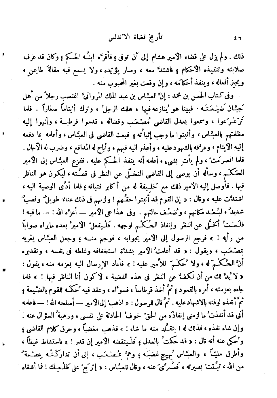 ذَلِك. وَلم يزل على قَضَاء الْأَمِير هِشَام إِلَى أَن توفّي؛ فأقره ابْنه الحكم؛ وَكَانَ قد عرف صلابته وتنفيذه الْأَحْكَام؛ فَاشْتَدَّ مَعَه، وَصَارَ يُؤَيّدهُ، وَلَا يسمع فِيهِ مقَالَة طَاعن، ويجيز أَفعاله، وَينفذ أَحْكَامه، وَإِن وَقعت بِغَيْر المحبوب مِنْهُ. وَفِي كتاب الْحسن بن مُحَمَّد: إِن الْعَبَّاس بن عبد الْملك المرواني اغتصب رجلا من أهل جيان ضيعته. فَبينا هُوَ ينازعه فِيهَا، هلك الرجل، وَترك أيتاماً صغَارًا. فَلَمَّا ترعرعوا، وسمعوا بِعدْل القَاضِي مُصعب وقضائه، قدمُوا قرطبة، وأنهوا إِلَيْهِ مظلمتهم بِالْعَبَّاسِ، وأثبتوا مَا وَجب إثْبَاته؛ فَبعث القَاضِي فِي الْعَبَّاس، وأعلمه بِمَا دَفعه إِلَيْهِ الْأَيْتَام، وعرفه بالشهود عَلَيْهِ، وأعذر إِلَيْهِ فيهم، وأباح لَهُ المدافع، وَضرب لَهُ الْآجَال فَلَمَّا انصرمت، وَلم يَأْتِ بِشَيْء، أعلمهُ أَنه ينفذ الحكم عَلَيْهِ. فَفَزعَ الْعَبَّاس إِلَى الْأَمِير الحكم، وَسَأَلَهُ أَن يوصى إِلَى القَاضِي التخلي عَن النّظر فِي قصَّته، ليَكُون هُوَ النَّاظر فِيهَا. فأوصل إِلَيْهِ الْأَمِير ذَلِك مَعَ خَليفَة لَهُ من أكَابِر فتيانه؛ فَلَمَّا أدّى الْوَصِيَّة إِلَيْهِ، اشتدت عَلَيْهِ، وَقَالَ: إِن الْقَوْم قد أثبتوا حَقهم {ولزمهم فِي ذَلِك عناء طَوِيل وَنصب شَدِيد، لبعد مكانهم، وَضعف حالتهم. وَفِي هَذَا على الْأَمِير أعزه الله} مَا فِيهِ {فلست أتخلى عَن النّظر وإنفاذ الحكم لوجهه. فَلْيفْعَل الْأَمِير بعده مَا يرَاهُ صَوَابا من رَأْيه} فَرجع الرَّسُول إِلَى الْأَمِير بجوابه، فَوَجَمَ مِنْهُ؛ وَجعل الْعَبَّاس يغريه بمصعب، وَيَقُول: قد أعلمت الْأَمِير بِشدَّة استخفافه وغلطه فِي نَفسه، وَتَقْدِيره أَن الحكم لَهُ، وَلَا حكم للأمير عَلَيْهِ {فَأَعَادَ الْإِرْسَال إِلَيْهِ بعزمه مِنْهُ، يَقُول: لَا بُد لَك من أَن تكف عَن النّظر فِي هَذِه الْقَضِيَّة، لأَكُون أَنا النَّاظر فِيهَا} فَلَمَّا جَاءَهُ بعزمته، أمره بالقعود؛ ثمَّ أَخذ قرطاساً، فسواه، وَعقد فِيهِ حكمه للْقَوْم بالضيعة؛ ثمَّ أنفذه لوقته بالاشهاد عَلَيْهِ. ثمَّ قَالَ للرسول: اذْهَبْ إِلَى الْأَمِير أصلحه الله {فاعلمه أَنِّي قد أنفذت مَا لزمني إِنْفَاذه من الْحق خوف الْحَادِثَة على نَفسِي، وَرَهْبَة السُّؤَال عَنهُ. وَإِن شَاءَ نفذه، فَذَلِك لَهُ} يتقلد مِنْهُ مَا شَاءَ {فَذهب مغضباً، وَحرق كَلَام القَاضِي؛ وَحكى عَنهُ أَنه قَالَ: قد حكمت بِالْعَدْلِ؛ فلينقضه الْأَمِير إِن قدر} فاستشاط غيظاً، وأطرق مَلِيًّا، وَالْعَبَّاس يهيج غَضَبه؛ وهم بمصعب، إِلَى أَن تداركته عصمَة من الله، ثبتَتْ بصيرته، فسرى عَنهُ، وَقَالَ للْعَبَّاس: إربع على ظلعك! فَمَا أشقاه