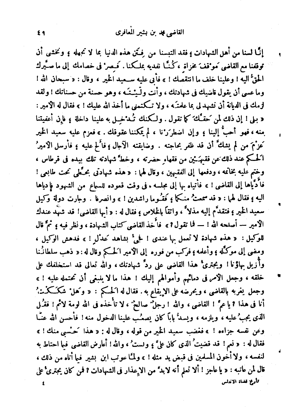 لسنا من أهل الشَّهَادَات؛ فقد التبسنا من فتن هَذِه الدُّنْيَا بِمَا لَا تجهله؛ ونخشى أَن توقفنا مَعَ القَاضِي موقف مخزاة، كُنَّا نفديه بملكنا. فصر فِي خصامك إِلَى مَا صيرك الْحق إِلَيْهِ {وعلينا خلف مَا انتقصك} فَأبى عَلَيْهِ سعيد الْخَيْر، وَقَالَ: سُبْحَانَ الله {وَمَا عَسى أَن يَقُول قاضيك فِي شهادتك، وَأَنت وليته، وَهُوَ حَسَنَة من حَسَنَاتك} وَلَقَد لزمك فِي الدّيانَة أَن تشهد لي بِمَا عَلمته، وَلَا تكتمني مَا أَخذ الله عَلَيْك {فَقَالَ لَهُ الْأَمِير: بلَى} إِن ذَلِك لمن حَقك كَمَا تَقول. وَلَكِنَّك تدخل بِهِ علينا دَاخِلَة؛ فَإِن أعفيتنا مِنْهُ، فَهُوَ أحب إِلَيْنَا؛ وَإِن اضطررنا، لم يمكننا عقوقك. فعزم عَلَيْهِ سعيد الْخَيْر عزم من لم يشك أَن قد ظفر بحاجته. وضايقته الْآجَال؛ فألج عَلَيْهِ؛ فَأرْسل الْأَمِير الحكم عِنْد ذَلِك عَن فقيهين من فُقَهَاء حَضرته، وَخط شَهَادَته تِلْكَ بِيَدِهِ فِي قرطاس، وَختم عَلَيْهِ بِخَاتمِهِ، وَدفعهَا إِلَى الفقهين، وَقَالَ لَهما: هَذِه شهادتي بحطى تَحت طابعي {فأدياها إِلَى القَاضِي} فَأتيَاهُ بهَا إِلَى مَجْلِسه، فِي وَقت قعوده للسماع من الشُّهُود فإدياها إِلَيْهِ؛ فَقَالَ لَهما: قد سَمِعت مِنْكُمَا؛ فقوما راشدين {وانصرفا. وجارت دولة وَكيل سعيد الْخَيْر؛ فَتقدم إِلَيْهِ مذلاً، واثقاً بالخلاص؛ فَقَالَ لَهُ: أَيهَا القَاضِي} قد شهد عنْدك الْأَمِير أصلحه الله {فَمَا تَقول؟ فَأخذ القَاضِي كتاب الشَّهَادَة، وَنظر فِيهِ؛ ثمَّ قَالَ للْوَكِيل: هَذِه شَهَادَة لَا تعْمل بهَا عِنْدِي} فجيء بِشَاهِد عدل {فدهش الْوَكِيل، وَمضى إِلَى مُوكله؛ وأعلمه؛ فَركب من فوره إِلَى الْأَمِير الحكم وَقَالَ لَهُ: ذهب سلطاننا وأزيل بهاؤنا} ويجترئ هَذَا القَاضِي على رد شهادتك، وَالله تَعَالَى قد استخلفك على خلقه، وَجعل الْأَمر فِي دِمَائِهِمْ وَأَمْوَالهمْ إِلَيْك {هَذَا مَا لَا يَنْبَغِي أَن تحتمله عَلَيْهِ} وَجعل يغريه بِالْقَاضِي، ويحرضه على الْإِيقَاع بِهِ. فَقَالَ لَهُ الحكم: وَهل شَككت أَنا فِي هَذَا؟ يَا عَم {القَاضِي، وَالله} رجل صَالح، لَا تَأْخُذهُ فِي الله لومة لائم {فَقل الَّذِي يجب عَلَيْهِ، وَيلْزمهُ، ويسد بَابا كَانَ يصعب علينا الدُّخُول مِنْهُ} فَأحْسن الله عَنَّا وَعَن نَفسه جزاءه {فَغَضب سعيد الْخَيْر من قَوْله، وَقَالَ لَهُ: هَذَا حسبي مِنْك} فَقَالَ لَهُ: نعم {قد قضيت الَّذِي كَانَ عَليّ؛ وَلست، وَالله} أعارض القَاضِي فِيمَا أحتاط بِهِ لنَفسِهِ، وَلَا أخون الْمُسلمين فِي قبض يَد مثله {وَلما عوتب ابْن بشير فِيمَا أَتَاهُ من ذَلِك، قَالَ لمن عاتبه: يَا عَاجز} أَلا تعلم أَنه لَا بُد من الْإِعْذَار فِي الشَّهَادَات؟ فَمن كَانَ يجترى على