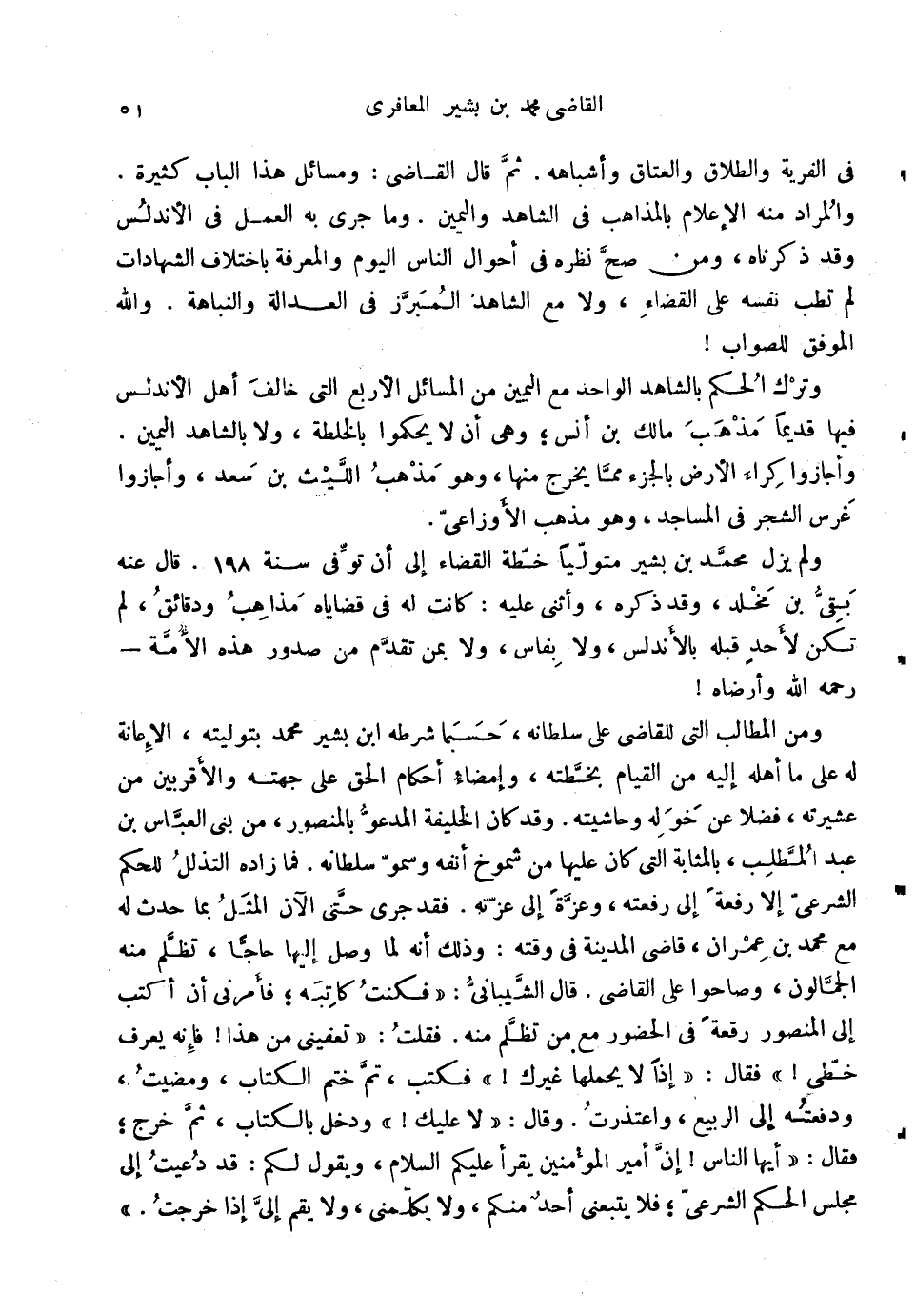 فِي الْفِرْيَة وَالطَّلَاق وَالْعتاق وأشباهه. ثمَّ قَالَ القَاضِي: ومسائل هَذَا الْبَاب كَثِيرَة. وَالْمرَاد مِنْهُ الْإِعْلَام بالمذاهب فِي الشَّاهِد وَالْيَمِين. وَمَا جرى بِهِ الْعَمَل فِي الأندلس وَقد ذَكرْنَاهُ، وَمن صَحَّ نظهر فِي أَحْوَال النَّاس الْيَوْم والمعرفة باخْتلَاف الشَّهَادَات لم تطب نَفسه على الْقَضَاء، وَلَا مَعَ الشَّاهِد المبرز فِي الْعَدَالَة والنباهة. وَالله الْمُوفق للصَّوَاب {وَترك الحكم بِالشَّاهِدِ الْوَاحِد مَعَ الْيَمين من الْمسَائِل الْأَرْبَع الَّتِي خَالف أهل الأندلس فِيهَا قَدِيما مَذْهَب مَالك بن أنس؛ وَهِي أَن لَا يحكموا بالخلطة، وَلَا بِالشَّاهِدِ الْيَمين. وأجازوا كِرَاء الأَرْض بالجزء مِمَّا يخرج مِنْهَا، وَهُوَ مَذْهَب اللَّيْث بن سعد، وأجازوا غرس الشّجر فِي الْمَسَاجِد، وَهُوَ مَذْهَب الْأَوْزَاعِيّ. وَلم يزل مُحَمَّد بن بشير مُتَوَلِّيًا خطة الْقَضَاء إِلَى أَن توفّي سنة 198. قَالَ عَنهُ بَقِي بن مخلد، وَقد ذكره، وَأثْنى عَلَيْهِ: كَانَت لَهُ فِي قضاياه مَذَاهِب ودقائق، لم تكن لأحد قبله بالأندلس، وَلَا بفاس، وَلَا بِمن تقدم من صُدُور هَذِه الْأمة رَحمَه الله وأرضاه} وَمن المطالب الَّتِي للْقَاضِي على سُلْطَانه، حَسْبَمَا شَرطه ابْن بشير مُحَمَّد بتوليته، والإعانة لَهُ على مَا أَهله إِلَيْهِ من الْقيام بخطته، وإمضاء أَحْكَام الْحق على جِهَته والأقربين من عشيرته، فضلا عَن خوله وحاشيته. وَقد كَانَ الْخَلِيفَة الْمَدْعُو بالمنصور، من بنى الْعَبَّاس بن عبد الْمطلب، بالمثابة الَّتِي كَانَ عَلَيْهَا من شموخ أَنفه وسمو سُلْطَانه. فَمَا زَاده التذلل للْحكم الشَّرْعِيّ إِلَّا رفْعَة إِلَى رفعته، وَعزة إِلَى عزته. فقد جرى حَتَّى الْآن الْمثل بِمَا حدث لَهُ مَعَ مُحَمَّد بن عمرَان، قَاضِي الْمَدِينَة فِي وقته: وَذَلِكَ أَنه لما وصل إِلَيْهَا حَاجا، تظلم مِنْهُ الجمالون، وصاحوا على القَاضِي. قَالَ الشَّيْبَانِيّ: فَكنت كَاتبه؛ فَأمرنِي أَن أكتب إِلَى الْمَنْصُور رقْعَة فِي الْحُضُور مَعَ من تظلم مِنْهُ. فَقلت: تعفيني من هَذَا {فَإِنَّهُ يعرف خطي} فَقَالَ: إِذا لَا يحملهَا غَيْرك {فَكتب، تمّ ختم الْكتاب، ومضيت، ودفعته إِلَى الرّبيع، واعتذرت. وَقَالَ: لَا عَلَيْك} وَدخل بِالْكتاب، ثمَّ خرج؛ فَقَالَ: أَيهَا النَّاس! إِن أَمِير الْمُؤمنِينَ يقْرَأ عَلَيْكُم السَّلَام؛ وَيَقُول لكم: قد دعيت إِلَى مجْلِس الحكم الشَّرْعِيّ؛ فَقَالَ يَتبعني أحد مِنْكُم، وَلَا يكلمني، وَلَا يقم إِلَى إِذا خرجت.