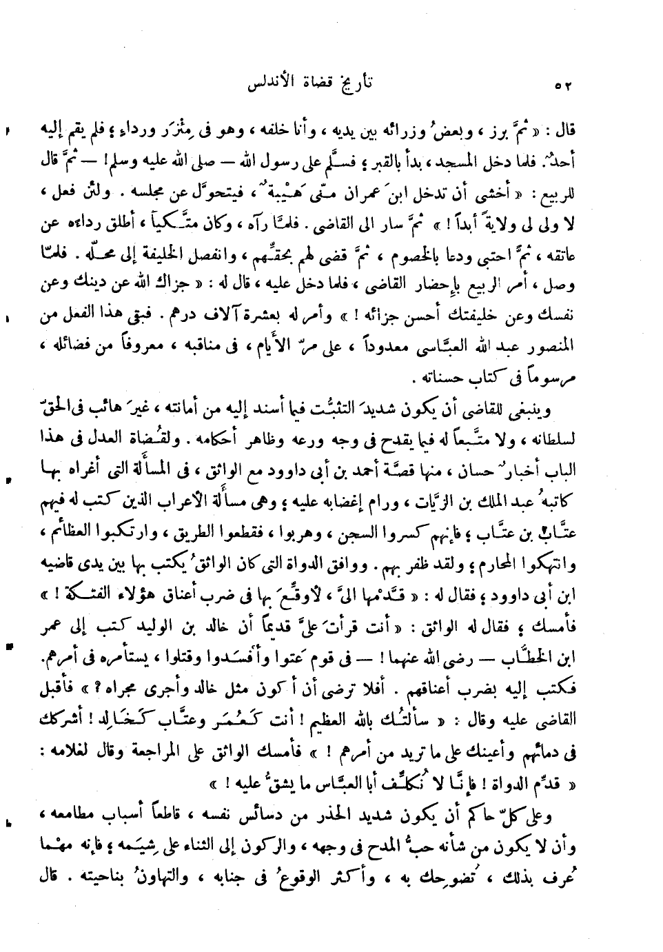 قَالَ: ثمَّ برز، وَبَعض وزرائه بَين يَدَيْهِ، وَأَنا خَلفه، وَهُوَ فِي مئزر ورداء؛ فَلم يقم إِلَيْهِ أحد. فَلَمَّا دخل الْمَسْجِد، بَدَأَ بالقبر؛ فَسلم على رَسُول الله صلى الله عَلَيْهِ وَسلم {ثمَّ قَالَ للربيع: أخْشَى أَن تدخل ابْن عمرَان مَتى هَيْبَة، فيتحول عَن مَجْلِسه. وَلَئِن فعل، لَا ولي لي ولَايَة أبدا} ثمَّ سَار إِلَى القَاضِي. فَلَمَّا رَآهُ، وَكَانَ متكياً، أطلق رِدَاءَهُ عَن عَاتِقه، ثمَّ احتبى ودعا بالخصوم، ثمَّ قضى لَهُم بحقهم، وانفصل الْخَلِيفَة إِلَى مَحَله. فَلَمَّا وصل أَمر الرّبيع بإحضار القَاضِي، فَلَمَّا دخل عَلَيْهِ، قَالَ لَهُ: جَزَاك الله عَن دينك وَعَن نَفسك وَعَن خليفتك أحسن جَزَائِهِ {وَأمر لَهُ بِعشْرَة آلَاف دِرْهَم. فبقى هَذَا الْفِعْل من الْمَنْصُور عبد الله العباسي معدوداً، على مر الْأَيَّام، فِي مناقبه، مَعْرُوفا من فضائله، مرسوماً فِي كتاب حَسَنَاته. وَيَنْبَغِي للْقَاضِي أَن يكون شَدِيد التثبت فِيمَا أسْند إِلَيْهِ من أَمَانَته، غير هائب فِي الْحق لسلطانه، وَلَا مُتبعا لَهُ فِيمَا يقْدَح فِي وَجه ورعه وَظَاهر أَحْكَامه. ولقضاة الْعدْل فِي هَذَا الْبَاب أَخْبَار حسان، مِنْهَا قصَّة أَحْمد بن أبي دَاوُود مَعَ الواثق، فِي المسالة الَّتِي أغراه بهَا كَاتبه عبد الْملك بن الزيات، ورام إغضابه عَلَيْهِ؛ وَهِي مَسْأَلَة الْأَعْرَاب الَّذين كتب لَهُ فيهم عتاب بن عتاب؛ فَإِنَّهُم كسروا السجْن، وهربوا، فَقطعُوا الطَّرِيق، وارتكبوا العظائم، وانتهكوا الْمَحَارِم؛ وَلَقَد ظفر بهم. وَوَافَقَ الدواة الَّتِي كَانَ الواثق يكْتب بهَا بَين يَدي قاضيه ابْن أبي دَاوُود؛ فَقَالَ لَهُ: قدمهَا إِلَيّ، لأوقع بهَا فِي ضرب أَعْنَاق هَؤُلَاءِ الفتكة} فَأمْسك؛ فَقَالَ لَهُ الواثق: أَنْت قَرَأت عَليّ قَدِيما أَن خَالِد بن الْوَلِيد كتب إِلَى عمر ابْن الْخطاب رَضِي الله عَنْهُمَا {فِي قوم عتوا وأفسدوا وَقتلُوا، يستأمره فِي أَمرهم. فَكتب إِلَيْهِ بِضَرْب أَعْنَاقهم. أَفلا ترْضى أَن أكون مثل خَالِد وأجرى مجْرَاه؟ فَأقبل القَاضِي عَلَيْهِ وَقَالَ: سَأَلتك بِاللَّه الْعَظِيم} أَنْت كعمر وعتاب كخالد {أشركك فِي دِمَائِهِمْ وأعينك على مَا تُرِيدُ من أَمرهم} فَأمْسك الواثق على الْمُرَاجَعَة وَقَالَ لغلامه: قدم الدواة {فَإنَّا لَا نكلف أَبَا الْعَبَّاس مَا يشق عَلَيْهِ} وعَلى كل حَاكم أَن يكون شَدِيد الحذر من دسائس نَفسه، قَاطعا أَسبَاب مطامعه، وَأَن لَا يكون من شَأْنه حب الْمَدْح فِي وَجهه، والركون إِلَى الثَّنَاء على شيمه؛ فَإِنَّهُ مهما عرف بذلك، تضوحك بِهِ، وَأكْثر الْوُقُوع فِي جنابه، والتهاون بناحيته. قَالَ