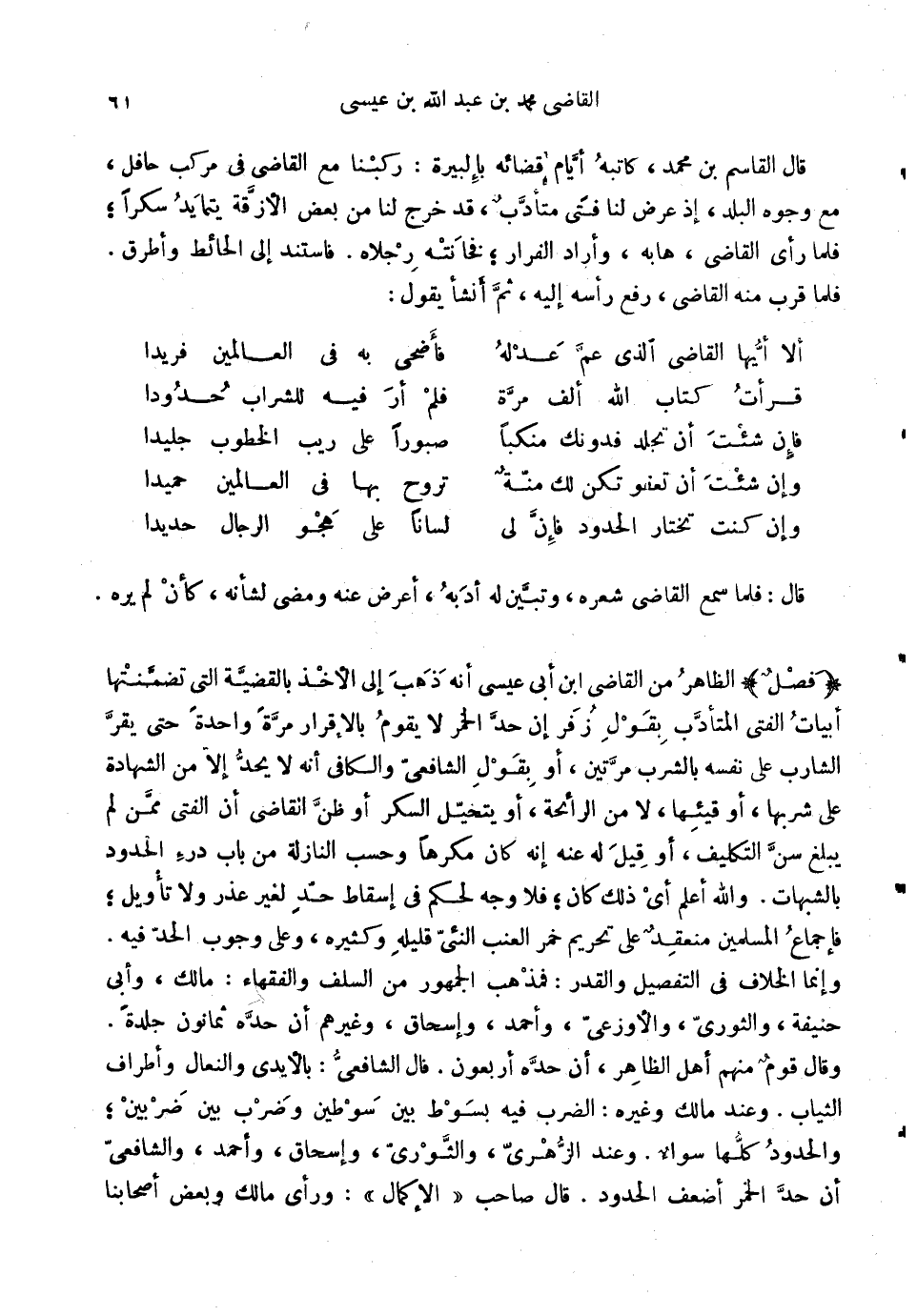 الظَّاهِر من القَاضِي ابْن أبي عِيسَى أَنه ذهب إِلَى الْأَخْذ بالقضية الَّتِي تضمنتها أَبْيَات الْفَتى المتأدب بقول زفر إِن حد الْخمر لَا يقوم بِالْإِقْرَارِ مرّة وَاحِدَة حَتَّى يقر الشَّارِب على نَفسه بالشرب مرَّتَيْنِ، أَو يَقُول الشَّافِعِي وَالْكَافِي أَنه لَا يحد إِلَّا من الشَّهَادَة على شربهَا أَو قيئها، لَا من الرَّائِحَة، أَو يتخيل السكر أَو ظن القَاضِي أَن الْفَتى مِمَّن لم يبلغ سنّ التَّكْلِيف، أَو قيل لَهُ عَنهُ إِنَّه كَانَ مكْرها وَحسب النَّازِلَة من بَاب دَرْء الْحُدُود بِالشُّبُهَاتِ. وَالله أعلم أَي ذَلِك كَانَ؛ فَلَا وَجه لحكم فِي إِسْقَاط حد لغير عذر وَلَا تَأْوِيل؛ فإجماع الْمُسلمين مُنْعَقد على تَحْرِيم خمر الْعِنَب النئ قَلِيله وَكَثِيره، وعَلى وجوب الْحَد فِيهِ. وَإِنَّمَا الْخلاف فِي التَّفْصِيل وَالْقدر: فمذهب الْجُمْهُور من السّلف وَالْفُقَهَاء: مَالك، وَأبي حنيفَة، وَالثَّوْري، والأوزعي، وَأحمد، وَإِسْحَاق، وَغَيرهم أَن حَده ثَمَانُون جلدَة وَقَالَ قوم مِنْهُم أهل الظَّاهِر، أَن حَده أَرْبَعُونَ. قَالَ الشَّافِعِي: بِالْأَيْدِي وَالنعال وأطراف الثِّيَاب. وَعند مَالك وَغَيره: الضَّرْب فِيهِ بِسَوْط بَين سوطين وَضرب ضَرْبَيْنِ؛ وَالْحُدُود كلهَا سَوَاء. وَعند الزُّهْرِيّ، وَالثَّوْري، وَإِسْحَاق، وَأحمد، وَالشَّافِعِيّ أَن حد الْخمر أَضْعَف الْحُدُود. قَالَ صَاحب الْإِكْمَال: وَرَأى مَالك وَبَعض أَصْحَابنَا