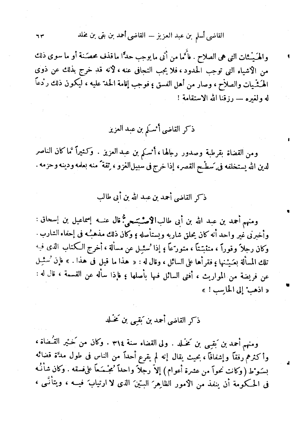 وَمن الْقُضَاة بقرطبة وصدور رجالها، أسلم بن عبد الْعَزِيز. وَكَثِيرًا مَا كَانَ النَّاصِر لدين الله يستخلفه فِي سطح الْقصر، إِذا خرج فِي سَبِيل الْغَزْو، ثِقَة مِنْهُ بِعِلْمِهِ وَدينه وحزمه.