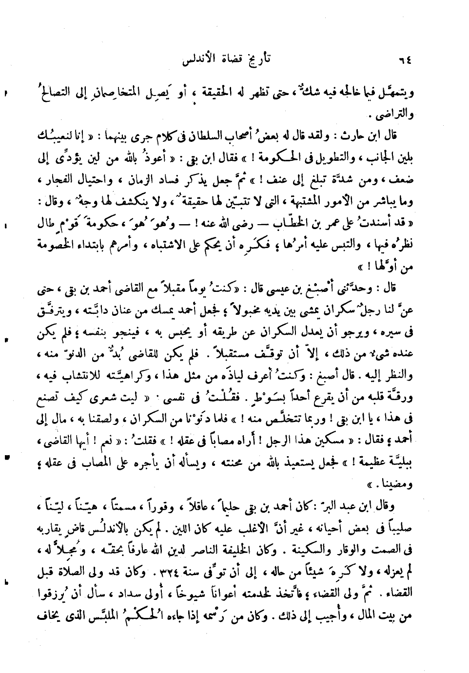 ويتمهل فِيمَا خالجه فِيهِ شكّ، حَتَّى تظهر لَهُ الْحَقِيقَة؛ أَو يصل المتخاصمان إِلَى التصالح والتراضي. قَالَ ابْن حَارِث: وَلَقَد قَالَ لَهُ بعض أَصْحَابه السُّلْطَان فِي كَلَام جرى بَينهمَا: إِنَّا لنعيبك بلين الْجَانِب، والتطويل فِي الْحُكُومَة {فَقَالَ لَهُ ابْن بَقِي: أعوذ بِاللَّه من لين يُؤَدِّي إِلَى ضعف، وَمن شدَّة تبلغ إِلَى عنف} ثمَّ جعل يذكر فَسَاد الزَّمَان، واحتيال الْفجار، وَمَا يُبَاشر من الْأُمُور المشتبهة، الَّتِي لَا تتبين لَهَا حَقِيقَة، وَلَا ينْكَشف لَهَا وَجه، وَقَالَ: قد أسندت على عمر بن الْخطاب رَضِي الله عَنهُ {وَهُوَ هُوَ، حُكُومَة قوم طَال نظره فِيهَا، والتبس عَلَيْهِ أمرهَا؛ فكره أَن يحكم على الِاشْتِبَاه، وَأمرهمْ بابتداء الْخُصُومَة من أَولهَا} قَالَ: وحَدثني أصبغ بن عِيسَى قَالَ: كنت يَوْمًا مُقبلا مَعَ القَاضِي أَحْمد بن بَقِي، حَتَّى عَن لنا رجل سَكرَان يمشي بَين يَدَيْهِ مخبولاً؛ فَجعل أَحْمد يمسك من عنان دَابَّته، ويترفق فِي سيره، ويرجو أَن يعدل السَّكْرَان عَن طَرِيقه أَو يحبس بِهِ، فينجو بِنَفسِهِ؛ فَلم يكن عِنْده شَيْء من ذَلِك، إِلَّا أَن توقف مُسْتَقْبلا. فَلم يكن للْقَاضِي بُد من الدنو مِنْهُ، وَالنَّظَر إِلَيْهِ. قَالَ أصبغ: وَكنت أعرف لياذه من مثل هَذَا، وكراهيته للانتشاب فِيهِ، ورقة قلبه من أَن يقرع أحدا بِسَوْط. فَقلت فِي نَفسِي: لَيْت شعري كَيفَ تصنع فِي هَذَا، يَا ابْن بَقِي {وَرُبمَا تتخلص مِنْهُ} فَلَمَّا دنونا من السَّكْرَان، ولصقنا بِهِ، مَال إِلَى أَحْمد؛ فَقَالَ: مِسْكين هَذَا الرجل {أرَاهُ مصاباً فِي عقله} فَقلت: نعم {أَيهَا القَاضِي، ببلية عَظِيمَة} فَجعل يستعيذ بِاللَّه من محنته، ويسأله أَن يأجره على الْمُصَاب فِي عقله؛ ومضينا. وَقَالَ ابْن عبد الْبر: كَانَ أَحْمد بن بَقِي حَلِيمًا، عَاقِلا، وقوراً، مسمتاً، هيناً، لينًا، صليباً فِي بعض أحيانه، غير أَن الْأَغْلَب عَلَيْهِ كَانَ اللين. لم يكن بالأندلس قَاض يُقَارِبه فِي الصمت وَالْوَقار والسكينة. وَكَانَ الْخَلِيفَة النَّاصِر لدين الله عَارِفًا بِحقِّهِ، ومجلاً لَهُ، لم يعزله، وَلَا كره شَيْئا من حَاله، إِلَى أَن توفّي سنة 324. وَكَانَ قد ولى الصَّلَاة قبل الْقَضَاء. ثمَّ ولى الْقَضَاء، فَاتخذ لخدمته أعواناً شُيُوخًا، وَأولى سداد، سَأَلَ أَن يرزقوا من بَيت المَال، وَأجِيب إِلَى ذَلِك. وَكَانَ من رسمه إِذا جَاءَهُ الحكم الملبس الَّذِي يخَاف
