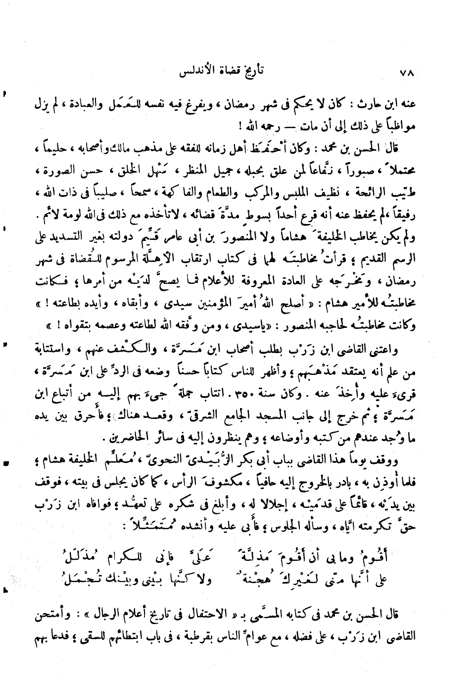 عَنهُ ابْن حَارِث: كَانَ لَا يحكم فِي شهر رَمَضَان، ويفرغ فِيهِ نَفسه للْعَمَل وَالْعِبَادَة، لم يزل مواظباً على ذَلِك إِلَى أَن مَاتَ رَحمَه الله {قَالَ الْحسن بن مُحَمَّد: وَكَانَ أحفظ أهل زَمَانه للفقه على مَذْهَب مَالك وَأَصْحَابه، حَلِيمًا، مُحْتملا، صبوراً، نَفَّاعًا لمن علق بحبله، جميل المنظر، سهل الْخلق، حسن الصُّورَة، طيب الرَّائِحَة، نظيف الملبس والمركب وَالطَّعَام والفاكهة، سَمحا، صليباً فِي ذَات الله، رَفِيقًا، لم يحفظ عَنهُ أَنه قرع أحدا بِسَوْط مُدَّة قَضَائِهِ، لَا تَأْخُذهُ مَعَ ذَلِك فِي الله لومة لائم. وَلم يكن يُخَاطب الْخَلِيفَة هشاماً وَلَا الْمَنْصُور بن أبي عَامر قيم دولته بِغَيْر التسديد على الرَّسْم الْقَدِيم؛ قَرَأت مخاطبته لَهما فِي كتاب ارتقاب الْأَهِلّة المرسوم للقضاة فِي شهر رَمَضَان، ومخرجه على الْعَادة الْمَعْرُوفَة للأعلام فَمَا يَصح لَدَيْهِ من أمرهَا؛ فَكَانَت مخاطبته للأمير هِشَام: أصلح الله أَمِير الْمُؤمنِينَ سيدى، وأبقاه، وأيد بِطَاعَتِهِ} وَكَانَت مخاطبته لحاجبه الْمَنْصُور: يَا سَيِّدي، وَمن وَفقه الله لطاعته وَعَصَمَهُ بتقواه! واعتنى القَاضِي ابْن زرب بِطَلَب أَصْحَاب ابْن مَسَرَّة، والكشف عَنْهُم، واستتابه من علم أَنه يعْتَقد مَذْهَبهم؛ وَأظْهر للنَّاس كتابا حسنا وَضعه فِي الرَّد على ابْن مَسَرَّة، قرئَ عَلَيْهِ وَأخذ عَنهُ. وَكَانَ سنة 350. اتتاب جملَة جِيءَ بهم إِلَيْهِ من أَتبَاع ابْن مَسَرَّة؛ ثمَّ خرج إِلَى جَانب الْمَسْجِد الْجَامِع الشَّرْقِي، وَقعد هُنَاكَ؛ فَأحرق بَين يَده مَا وجد عِنْدهم من كتبه وأوضاعه؛ وهم ينظرُونَ إِلَيْهِ فِي سَائِر الْحَاضِرين. ووقف يَوْمًا هَذَا القَاضِي بِبَاب أبي بكر الزبيدِيّ النَّحْوِيّ، معلم الْخَلِيفَة هِشَام؛ فَلَمَّا أُوذِنَ بِهِ، بَادر بِالْخرُوجِ إِلَيْهِ حافياً، مَكْشُوف الرَّأْس، كَمَا كَانَ يجلس فِي بَيته، فَوقف بَين يَدَيْهِ، قَائِما على قَدَمَيْهِ، إجلالاً لَهُ، وأبلغ فِي شكره على تعهد؛ فوافاه ابْن زرب حق تكرمته إِيَّاه، وَسَأَلَهُ الْجُلُوس؛ فَأبى عَلَيْهِ وأنشده متمثلاً: أقوم وَمَا بِي أَن أقوم مذلة ... عَليّ فَإِنِّي للكرام مذلل على أَنَّهَا مني لغيرك هجنة ... وَلَا كنها بيني وَبَيْنك تجمل قَالَ الْحسن بن مُحَمَّد فِي كِتَابه الْمُسَمّى ب الاحتفال فِي تَارِيخ أَعْلَام الرِّجَال: وأمتحن القَاضِي ابْن زرب، على فَضله، مَعَ عوام النَّاس بقرطبة، فِي بَاب ابتطائهم للسقي؛ فَدَعَا بهم