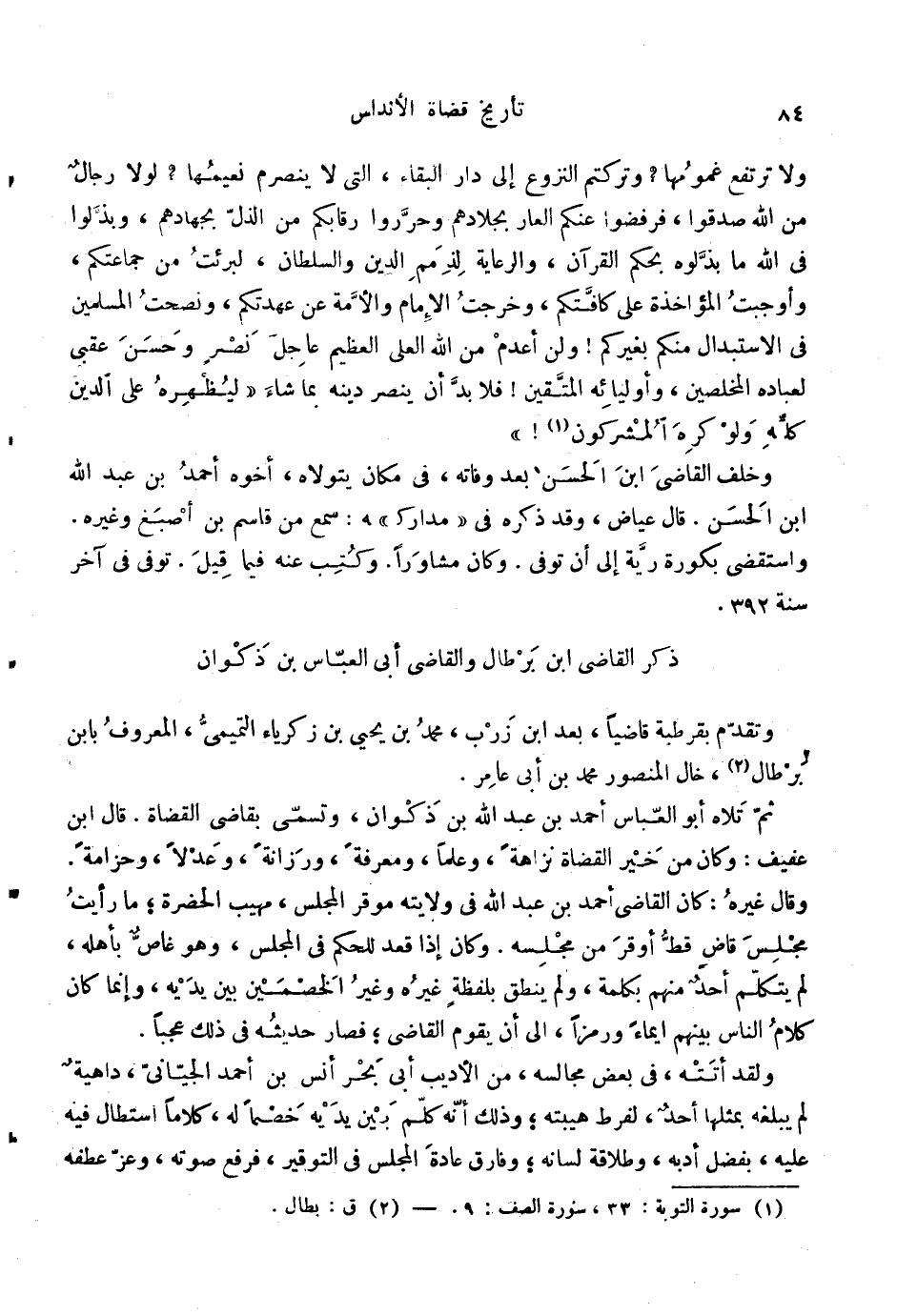 وَلَا ترْتَفع غمومها؟ وتركتم النُّزُوع إِلَى دَار الْبَقَاء، الَّتِي لَا ينصرم نعيمها؟ لَوْلَا رجال من الله صدقُوا، فَرَفَضُوا عَنْكُم الْعَار بجلادهم وحرروا رِقَابكُمْ من الذل بجهادهم، وبذلوا فِي الله مَا بذلوا بِحكم الْقُرْآن، وَالرِّعَايَة لذمم الدّين وَالسُّلْطَان، لبرئت من جماعتكم، وأوجبت الْمُؤَاخَذَة على كافتكم، وَخرجت الإِمَام وَالْأمة عَن عهدتكم، وَنَصَحْت الْمُسلمين فِي الِاسْتِبْدَال مِنْكُم بغيركم {وَلنْ أعدم من الله الْعلي الْعَظِيم عَاجل نصر وَحسن عُقبى لِعِبَادِهِ المخلصين، وأوليائه الْمُتَّقِينَ} فَلَا بُد أَن ينصر دينه بِمَا شَاءَ " لِيظْهرهُ على الدّين كُله وَلَو كره الْمُشْركُونَ! " وَخلف القَاضِي ابْن الْحسن بعد وَفَاته، فِي مَكَان يَتَوَلَّاهُ، أَخُوهُ أَحْمد بن عبد الله ابْن الْحسن. قَالَ عِيَاض، وَقد ذكر فِي مداركه: سمع من قَاسم بن أصبغ وَغَيره. واستقضى بكورة رية إِلَى أَن توفّي. وَكَانَ مشاوراً. وَكتب عَنهُ فِيمَا قيل. توفّي فِي آخر سنة 392.