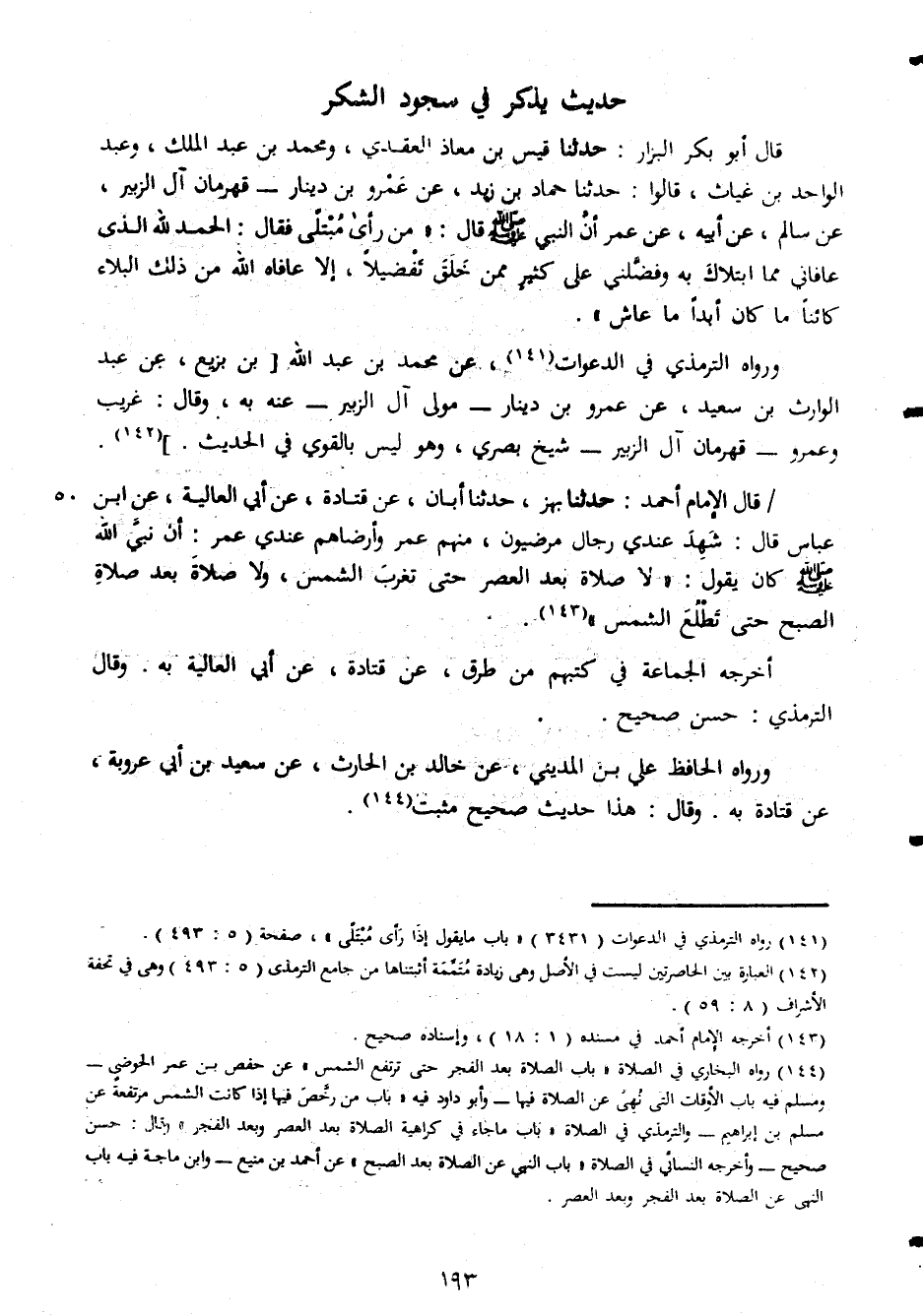 حديث يذكر فى سجود الشكر قال ابو بكر البزاز حدثنا قيس بن معاذ العقدى ومحمد بن عبد الملك وعبد الواحد بن غياث قالوا حدثنا حماد بن زيد عن عمرو بن دينار قهرمان ال الزبير عن سالم عن ابيه عن عمر ان النبى صلى الله عليه وسلم قال من رأى مبتلى فقال الحمد لله الذى عافانى مما ابتلاك به وفضلنى على كثير ممن خلق تفضيلا الا عافاه الله من ذلك البلاء كائنا ما كان ابدا ما عاش ورواه الترمذى فى الدعوات عن محمد بن عبد الملك بن بزيع عن عبد الوارث بن سعيد عن عمرو بن دينار مولى ال زبير عنه به وقال غريب وعمرو قهرمان ال الزبير شيخ بصرى وهو ليس بالقوى فى الحديث قال الامام احمد حدثنا بهز حدثنا ابان عن قتادة عن ابى العالية عن ابن عباس قال شهد عندى رجال مرضيمن منهم عمر وارضاهم عندى عمر ان نبى الله صلى الله عليه وسلم كان يقول لا صلاة بعد العصر حتى تغرب الشمس ولا صلاة بعد صلاة الصبح حتى تطلع الشمس اخرجه الجماعة فى كتبهم من طرق عن قتادة عن ابى العالية به وقال الترمذى حسن صحيح ورواه الحافظ على بن المدينى عن خالد بن الحارث عن سعيد بن ابى عروبة عن قتادة به وقال هذا حديث صحيح مثبت