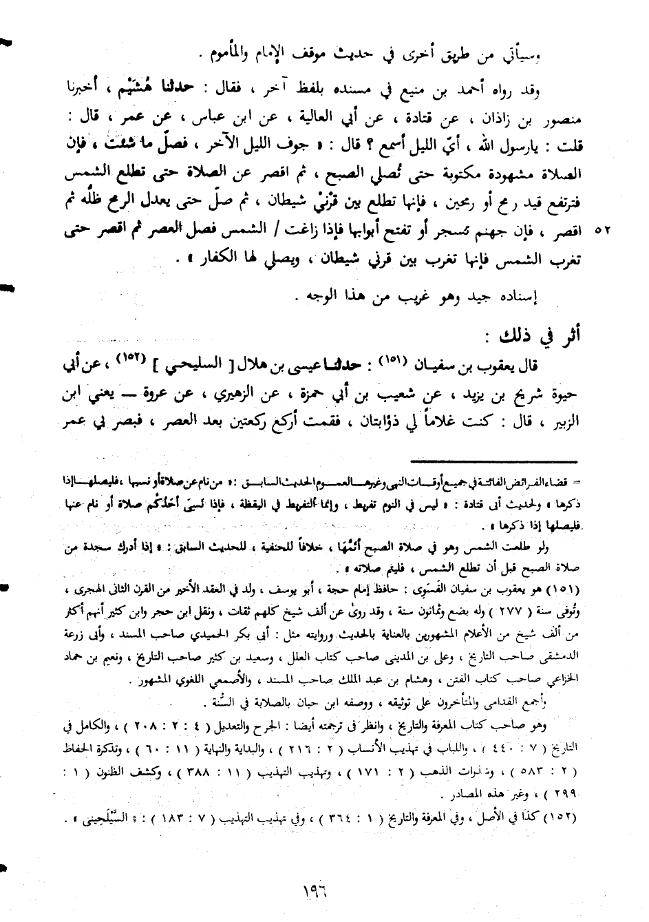 وسيأتى من طريق اخرى فى حديث موقف الامام والمأموم وقد رواه احمد بن منيع فى مسنده بلفظ آخر فقال حدثنا هشيم اخبرنا منصور بن زادان عن قتادة عن ابى العالية عن ابن عباس عن عمر قال قلت يا رسول الله اى الليل اسمع قال جوف الليل الآخر فصل ما شئت فإن الصلاة مشهودة مكتوبة حتى تصلى الصبح ثم اقصر عن اللاة حتى تطلع الشمس فترتفع قيد رمح او رمحين فانها تطلع بين قرنى شيطان ثم صل حتى يعدل الرمح ظله ثم اقصر فان جهنم تنسجر او تفتح ابوابها فاذا فرغت الشمس فصل العصر ثم اقصر حتى تغرب الشمس فانها تغرب بين شيطان ويصلى لها الكفار اسناده جيد وهو غريب من هذا الوجه اثر في ذ لك قال يعقوب بن سفيان حدثنا عيسى بن هلال السليحى عن حيوة شريح بن يزيد عن شعيب بن ابى حمزة عن الزهيرى عن عروة يعنى الزبير قال كنت غلاما لى ذؤابتان فقمت اركع بعد العصر فبصر بى
