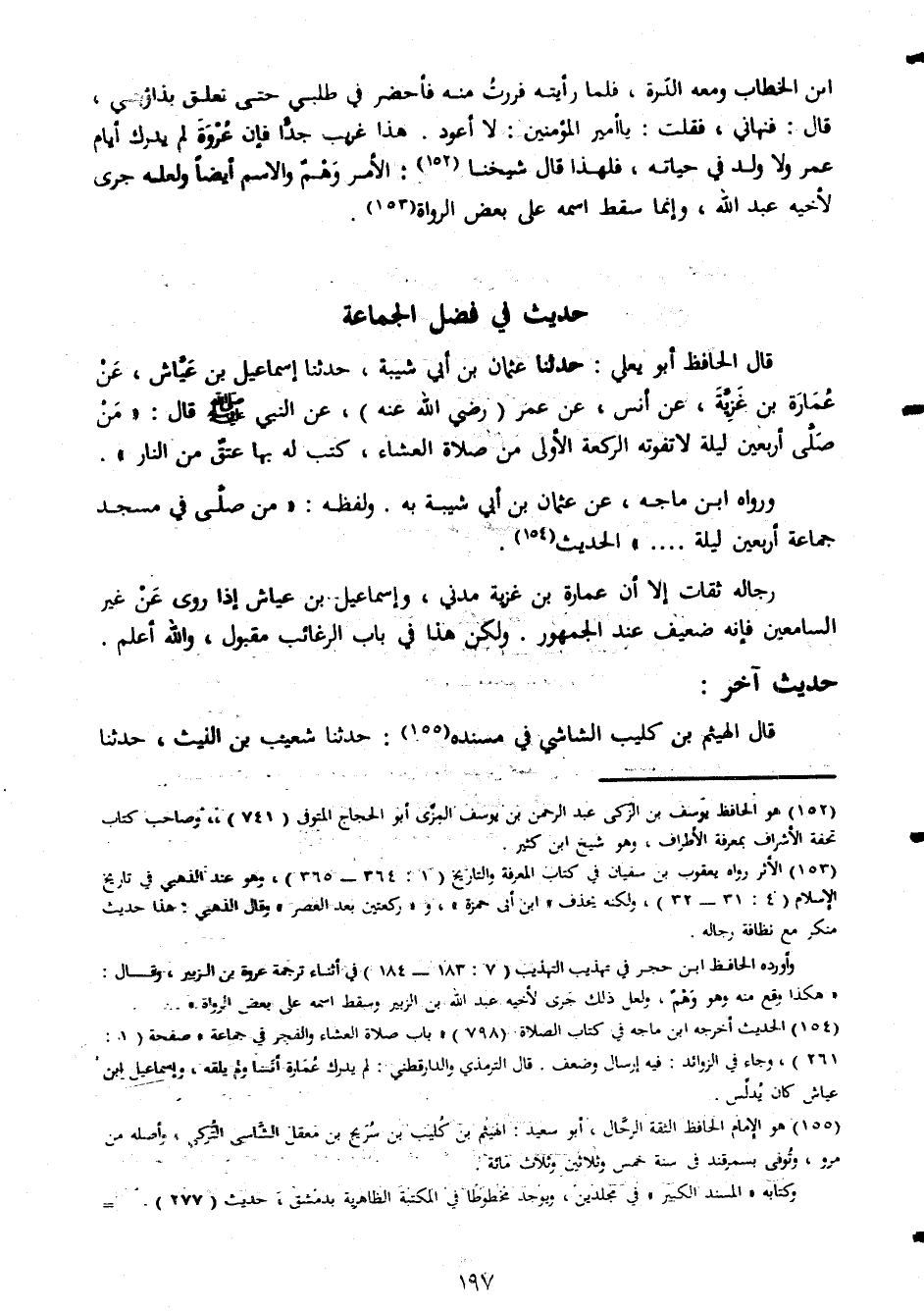 ابن الخطاب ومعه الدرة فلما رأيته فررت منه فأحضر فى طلبى حتى تعلق بذاؤبتى قال فنهانى فقلت يا أمير المؤمنين لا اعود هذا غريب جدا فإن عروة لم يدرك ايام عمر ولاولد فى حياته فلهذا قال شيخنا الامر وهم والاسم ايضا ولعله جرى لأخيه عبد الله وانما سقط اسمه على بعض الرواة حديث فى فضل الجماعة قال الحافظ ابو يعلى حدثنا عثمان بن ابى شيبة حدثنا اسماعيل بن عياش عن عمارة بن غزية عن انس عن عمر رضى الله عنه عن النبى صلى الله عليه وسلم قال من صلى اربعين ليلة لا تفوته الركة من صلاة العشاء كتب له بها عتق من النار ورواه ابن ماجه عن عثمان بن ابى شيبة به ولفظه من صلى فى مسجد جماعة اربعين ليلة الحديث رجاله ثقات الا ان عمارة بن غزية مدنى واسماعيل بن عيا شاذا روى عن غير السامعين فإنه ضعيف عند الجمهور ولكن هذا فى باب الرغائب مقبول والله أعلم حديث اخر قال الهيثم بن كليب الشاشى فى مسنده حدثنا شعيب بن الليث حدثنا