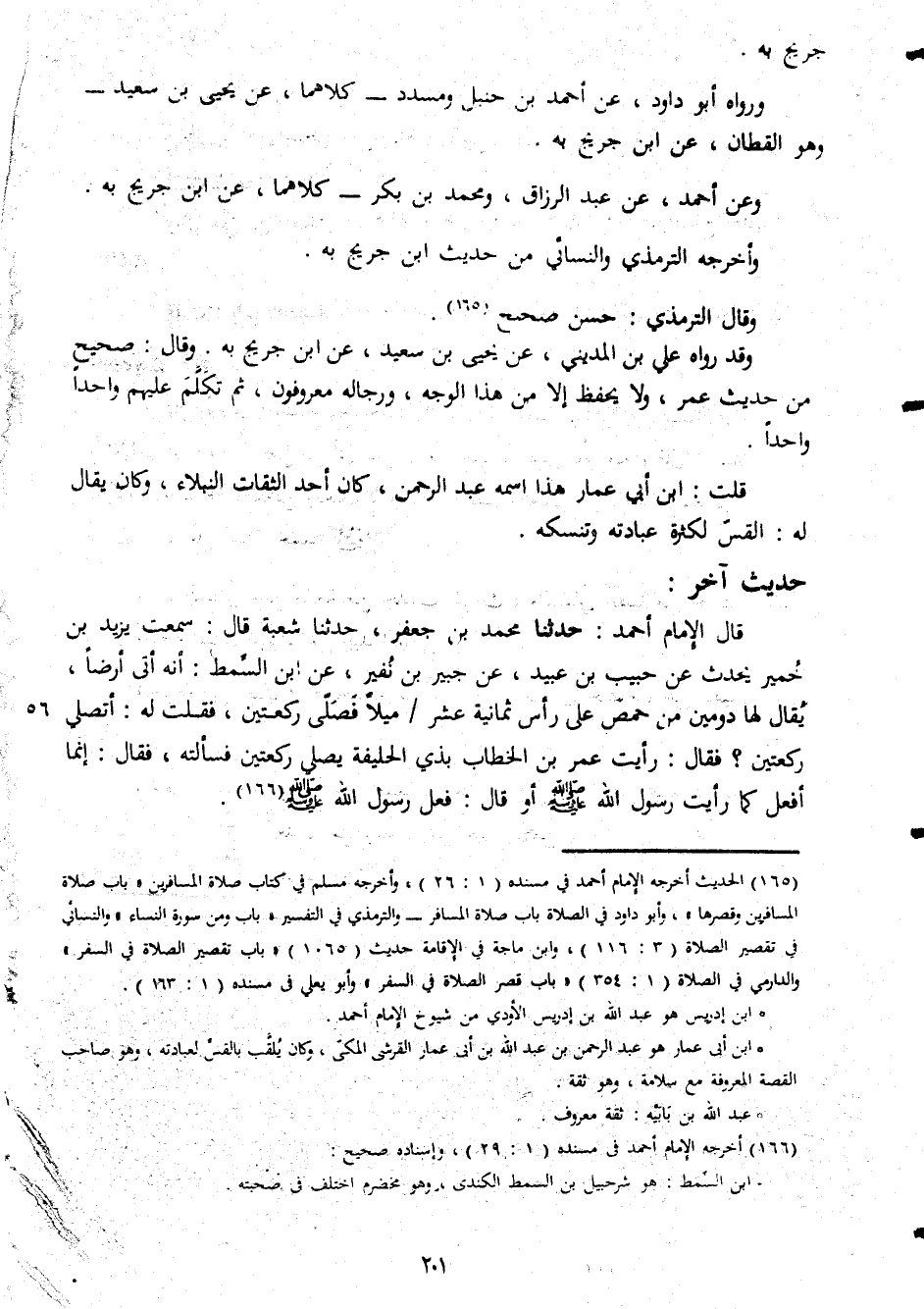 جريح به ورواه ابو داود عن احمد بن حنبل وسدد كلاهما عن يحيى بن سعيد وهو القطان عن ابن جريح به وعن احمد عن عبد الرزاق ومحمد بن بكر كلاهما عن ابن جريح به وقال الترمذى حسن صحيح وقد رواه على بن المدينى عن يحيى بن سعيد عن ابن جريح به وقال صحيح من حديث عمر ولا يحفظ الا من هذا الوجه ورجاله معرفون ثم تكلم عليهم واحدا واحدا قلت ابن ابى عمارة هذا اسمه عبد الرحمن كان احد الثقات النبلاء وكان يقال له القس لكثرة عبادته وتنسكه حديث اخر قال الامام احمد حدثنا محمد بن جعفر حدثنا شعبة قال سمعت يزيد بن خمير يحدث عن حبيب بن عبيد عن جبير بن نفير عن ابن السمط انه اتى ارضا يقال لها دومين من حمص على رأس ثمانية عشر ميلا فصلى ركعتين فسألته فقال انما افعل كما رايت رسول الله صلى الله عليه وسلم او قال فعل رسول الله صلى الله عليه وسلم
