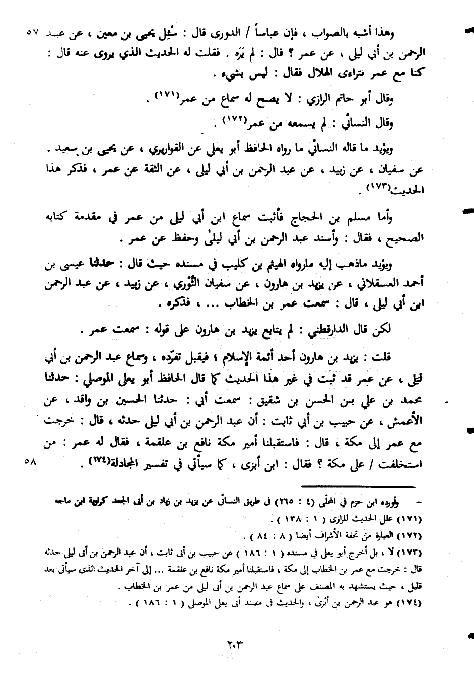 وهذا اشبه بالصواب فإن عباسا الدورى قال سئل يحيى بن معين عن عبد الرحمن بن ابى ليلى عن عمر قال لم يره فقلت له الحديث الذى يروى عنه قال كنا مع عمر تراءى الهلال فقال ليس بشىء وقال ابو حاتم الرازى لا يصح له سماع من عمر ويؤيد ما قاله النسائى ما رواه الحافظ ابو يعلى عن القواريرى عن يحيى بن سعيد عن سفيان عن زيد عن عبد الرحمن بن ابى ليلى عن الثقة عن عمر فذكر هذا الحديث وأما مسلم بن الحجاج فأثبت سماع ابن ابى ليلى من عمر فى مقدمة كتابه الصحيح فقال واسند عبد بن ابى ليلى وحفظ عن عمر يؤيد ماذهب اليه ماوراه الهيثم بن كليب فى مسنده حيث قال حدثنا عيسى بن احمد العسقلانى عن عن يزيد بن هارون عن سفيان الثورى عن زيد عن عبد الرحمن ابن ابى ليلى قال سمعت عمر بن الخطاب فذكره لكن قال الدارقطنى لم يتابع يزيد بن هارون على قوله سمعت عمر قلت يزيد بن هارون أحمد ائمة الاسلام فيقبل تفرده وسماع عبد الرحمن بن ابى ليلى عن عمر قد ثبت فى غير هذا الحديث كما قال الحافظ ابو يعلى الموصلى حدثنا محمد بن على الحسن بن شقيق سمعت ابى حدثنا الحسين بن واقد عن الاعمش عن حبيب بن ابى ثابت ان عبد الرحمن بن ابى ليلى حدثه قال خرجت مع عمر الى مكة قال فاستقبلنا امير مكة نافع بن علقمة فقال له عمر من استخلفت على مكة فقال ابن ابزى كما سيأتى فى تفسير المجادلة
