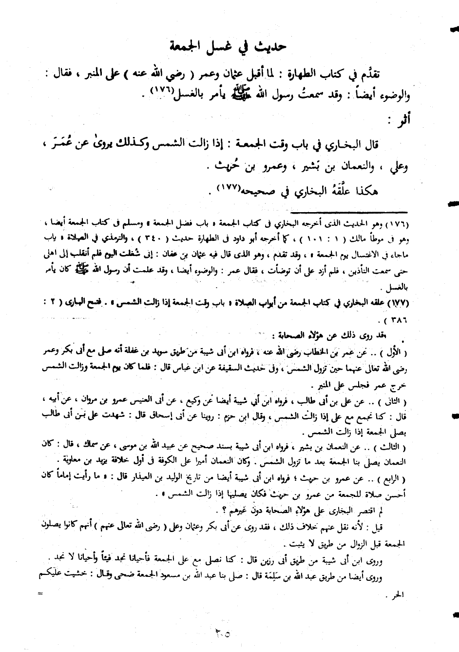 حديث فى غسل الجمعة تقدم فى كتاب الطهارة لما اقبل عثمان وعمر رضى الله عنه على المنبر فقال والوضوء ايضا وقد سمعت رسول الله صلى الله عليه وسلم يأمر بالغسل أثر قال البخارى فى باب وقت الجمعة اذا زالت وكذلك يروى عن عمر وعلى والنعمان بن بشير وعمرو بن حريث هكذا علقه البخارى فى صحيحه
