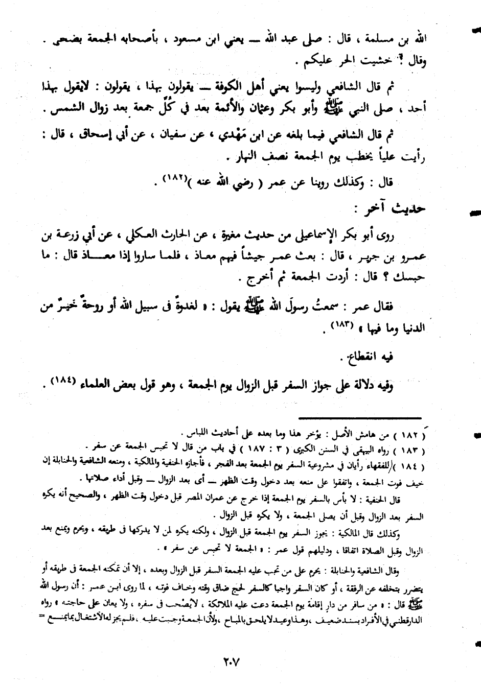 الله بن مسلمة قال صلى عبد الله يعنى ابن مسعود بأصحابه الجمعة يضحى وقال خشيت الحر عليكم ثم قال الشافعى وليسوا يعنى اهل الكوفة يقولون بهذا يقولون لا يقول بهذا احد صلى النبى صلى الله عليه وسلم وابو بكر وعثمان والائمة بعد فى كل جمعة بعد زوال الشمس ثم قال الشافعى فيما بلغه عن ابن مهدى عن سفيان عن ابى اسحاق قال رأيت عليا يخطب يوم الجمعة نصف النهار قال قال وكذلك روينا عن عمر رضى الله عنه حديث اخر وروى ابو بكر الاسماعيلى من حديث مغيرة عن الحارث العكلى عن ابى زرعة بن عمرو بن جرير قال بعث جيشا فيهم معاذ فلما ساروا اذا معاذ قال ما جسك قال اردت الجمعة ثم خرج فقال عمر سمعت رسول الله صلى الله عليه وسلم يقول لغدوة فى سبيل الله او روحة خير من الدنيا وما فيها فيه انقطاع وفيه دلالة على جواز السفر قبل الزوال يوم الجمعة وهو قول بعض العلماء