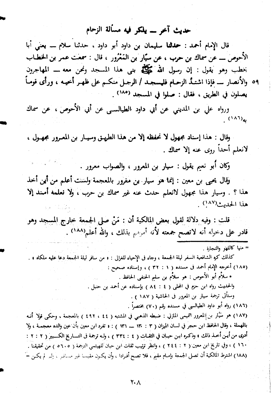حديث أخر يذكر فيه مسألة الزحام قال المام احمد حدثنا سليمان بن داود ابو داود حدثنا سلام يعنى ابا الاحوص عن سماك بن حرب عن سيار بن المعرور قال سمعت عمر بن الخطاب يخطب وهو يقول ان رسول الله صلى الله عليه وسلم بنى هذا المسجد ونحن معه المهاجرون والانصار فإذا اشتد الرخام فليسجد الرجل منكم على ظهر اخيه ورأى قوما يصلون فى الطريق فقال صلوا فى المسجد ورواه على بن المدينى عن ابى داود الطيالسى عن ابى الاحوص عن سماك به وقال هذا اسناد مجهول لا نحفظه الا من هذا الطريق وسيار بن المعرور مجهول لانعلم احدا روى عنه الا سماك وكان ابو نعيم يقول انما هو سيار بن مغرور بالمعجمة ولست أعلم من اين اخذ وسيار هذا مجهول لا نعلم حدث عنه غير سماك بن حرب ولا نعلمه أسند الا هذ الحديث قلت وفيه دلالة لقول بعض المالكية ان من صلى الجمعة خارج المسجد وهو قادر على دخوله انه لا تصبح لأنه امرهم بذلك والله أعلم