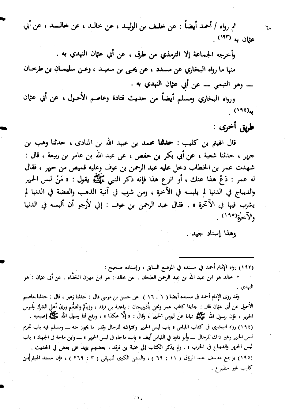 ثم رواه احمد ايضا عن خلف بن الوليد عن خالد عن خالد عن ابى عثمان به وأخرجه الجماعة الا الترمذى من طرق عن ابى عثمان النهدى به منها ما وراه البخارى عن مسدد عن يحيى بن سعيد وعن سليمان بن طرخان وهو التيمى عن ابى عثمان النهدى به ورواه البخارى ومسلم ايضا من حديث قتادة وعاصم الاحول عن ابى عثمان به طريق اخرى قال الهيثم بن كليب حدثنا محمد بن عبيد الله بن المنادى حدثنا وهب بن جرير حدثنا شعبة عن ابى بكر بن حفص بن عبد الله بن عامر بن ربيعة قال شهدت عمر بن الخطاب دخل عليه عبد الرحمن بن عوف وعليه قميص من جرير فقال له عمر دع هذا عنك او أنزع هذا فإنه ذكر النبى صلى الله عليه وسلم يقول من ليس الحرير والديباج فى الدبيا لم يلبسه فى الاخرة ومن شرب فى آنية الذهب والفضة فى الدنيا لم يشرب فيها فى الاخرة فقال عبد الرحمن بن عوف انة لأرجو ان ألبسه فى الدنيا والاخرة وهذا اسناد جيد