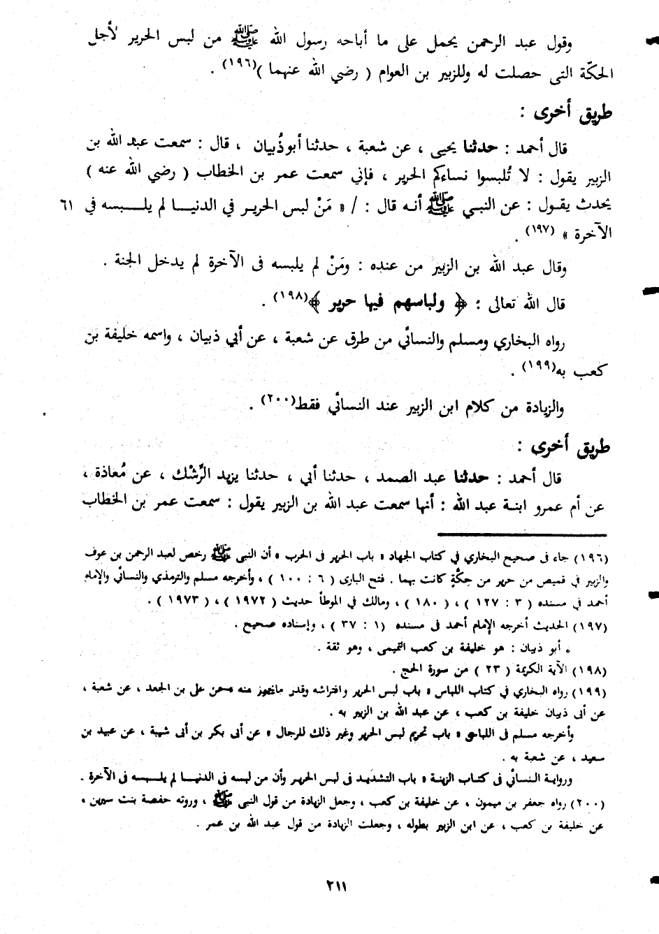 وقول عبد الرحمن يحمل على ما اباحه رسول الله صلى الله عليه وسلم من لبس لأجل الحكة التى حصلت له وللزبير بن العوام رضى الله عنهما طريق اخرى قال احمد حدثنا يحيى عن شعبة حدثنا ابو ذبيان قال سمعت عبد الله بن الزبير يقول لا تلبسوا نساءكم الحرير فإنى سمعت عر بن الخطاب رضى الله عنه يحدث يقول عن النبى صلى الله عليه وسلم أنه قال من لبس الحرير فى الدنيا لم يلبسه فى الأخرة وقال عبد الله بن الزبير من عنده ومن لم يلبسه فى الاخرة لم يدخل الجنة قال الله تعالى ولبلسهم فيها حرير رواه البخارى ومسلم والنسائى من طريق عن شعبة عن ابى ذبيان واسمه خليفة بن كعب به والزيادة من كلام ابن الزبير عند النسائى فقط طريق اخرى قال احمد حدثنا عبد الصمد حدثنا ابى حدثنا يزيد الرشك عن معاذة عن ام عمرو ابنة عبد الله انها سمعت عبد الله بن الزبير يقول سمعت عمر بن الخطاب