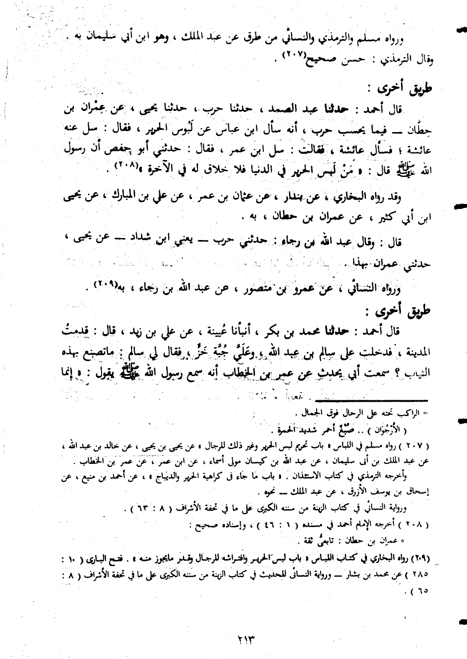 ورواه مسلم الترمذى والنسائى من طريق عن عبد الملك وهو ابن ابى سليمان به وقال الترمذى حسن صحيح طريق اخرى قال احمد حدثنا عبد الصمد حدثنا حرب حدثنا يحيى عن عمران بن حطان فيما يحسب حرب انه سأل ابن عباس عن لبوس الحرير فقال سل عنه عائشة فسأل عائشة فقالت سل ابن عمر فقال حدثنى ابو حفص ان سول الله صلى الله عليه وسلم قال من لبس الحرير فى الدنيا فلا خلاف له فى الاخرة وقد رواه البخارى عن بندار عن عثمان بن عمر عن على بن المبارك عن يحيى ابن ابى كثير عن عمران بن حطا نبه قال وقال عبد الله بن رجاء حدثنى حرب يعنى ابن شداد عن يحيى حدثنى عمران بهذا ورواه النسائى عن عمرو بن منصور عن عبد الله بن رجاء به طريق اخرى قال احمد حدثنا محمد بن بكر انبأنا عيينة عن على بن زيد قال قدمت المدينة فدخلت على سالم بن عبد الله وعلى جبة حز فقال لى سالم ما تصنع بهذه الثياب سمعت ابى يحدث عن عمر بن الخطاب انه سمع رسول الله صلى الله عليه وسلم يقول انما