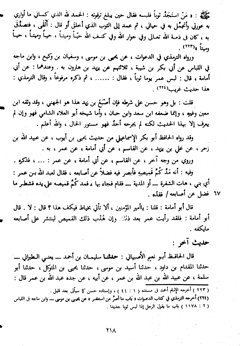 صلى الله عليه وسلم من استجد ثوبا فلبسه فقال حين يبلغ ترقوته الحمد لله الذى كسانى ما اوارى به عورتى واتجمل به فى حياتى ثم عمد الى الثوب الذى أخلق أو قال القى فتصدق به كان فى ذمة الله تعالى وفى جوار الله وفى كنف الله حيا وميتا حيا وميتا ورواه الترمذى فى الدعوات عن يحيى بن موسى وسفيان بن وكيع وابن ماجه فى اللباس عن ابى بكر بن شيبة ثلاثتهم عن يزيد بن هارون به عندهما عن ابى أمامة قال لبس عمر يوما ثوبا فقال ثم ذكره مرفوعا وقال الترمذى هذا حديث غريب قلت بل وهو حسن على شرطة فإن أصبع بن زيد هذا هو الجهنى وقد وثقه ابن معين وغيره وانما ضعفه ابن سعد وابن حبان واما شيخة ابو العلاء الشامى فهو وان لم يعرف الا بهذا الحديث لكنه لم يجرحه احد فهو مستور الحال والله ظاعلم وقد رواه الحافظ ابو بكر الاسماعيلى من حديث يحيى بن ايوب عن عبيد الله بن زحر عن على بن يزيد عن القاسم عن ابى امامة عن عمر فذكره وفيه انه مدكم قميصه فأبصر فيه فضلا عن اصابعه فقال لعبد الله بن عمر اى بنى هات الشفرة او المدية فقام فجاء بها فمد كم قميصه على يده فشطر ما فضل عن اصابعه فقده قال ابو امامة قلنا ياأمير المؤمنين الا تأتى بخياط فكيف هذا قال لا قال ابو امامة فلقد رأيت عمر بعد ذلك وان هدب ذلك القميص لينتشر على اصابعه ما يكفيه حديث اخر قال الحافظ ابو نعيم الاصبهانى حدثنا سليمان بن أحمد يعنى الطبرانى حدثنا المقدام بن داود حدثنا أسيد بن موسى حدثنا يحيى بن المتوكل حدثنا ابو سلمة عن عبيد الله بن عبد الله بن عمر عن ابيه عن جده عبد الله بن عمر قال