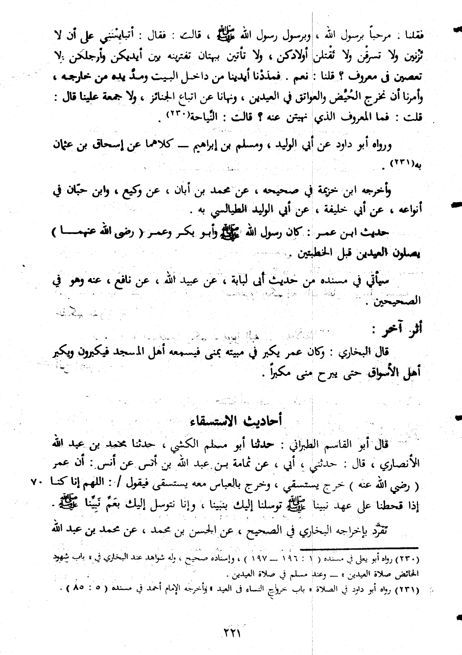 فقلنا مرحبا برسول الله وبرسول رسول الله صلى الله عليه وسلم قالت فقال اتبايعتنى على ان لا تزين ولا تسرقن ولا تقتلن اولادكن ولا تأتين ببهتان تفترينه بين ايديكن وارجلكن ولا تعصين فى معروف قلنا نعم فمددنا ايدينا من داخل البيت ومديده من خارجة وأمرنا ان نخرج الحيض والعواتق فى العيدين ونهانا عن اتباع الجنائز ولا جمعة علينا قال قلت فما المعروف الذى نهيتن عنه قالت النياحة ورواه ابو داود عن ابى الوليد ومسلم بن ابراهيم كلاهما عن اسحاق بن عثمان به واخرجه ابن خزيمة فى صحيحه عن محمد بن ابان عن وكيع وابن حبان فى انواعه عن ابى خليفة عن ابى الوليد الطيالسى به حديث ابن عمر كان رسول الله صلى الله عليه وسلم وابو بكر وعمر رضى الله عنهما يصلون العيدين قبل الخطبتين سيأتى فى مسنده من حديث ابى لبابة عن عبيد الله عن نافع عنه وهو فى الصحيحين اثر اخر قا لالبخارى وكان وعمر يكبر فى بمنى فيسمعه اهل المسجد فيكبرون ويكبر اهل الاسواق حتى يبرح منى مكبرا أحاديث الاستسقاء قال ابو القاسم الطبرانى حدثنا محمد بن عبد الله الانصارى قال حدثنى ابى عن تمامة بن عبد الله بن انس ان عمر رضى الله عنه خرج يستسقى وخرج بالعباس معه يستسقى فيقول اللهم انا كنا اذا قحطنا على عهد نبينا صلى الله عليه وسلم توسلنا اليك نبينا وانا نتوسل اليك بعم نبينا صلى الله عليه وسلم تفرد بإخراجه البخارى فى الصحيح عن الحسن بن محمد عن محمد بن عبد الله