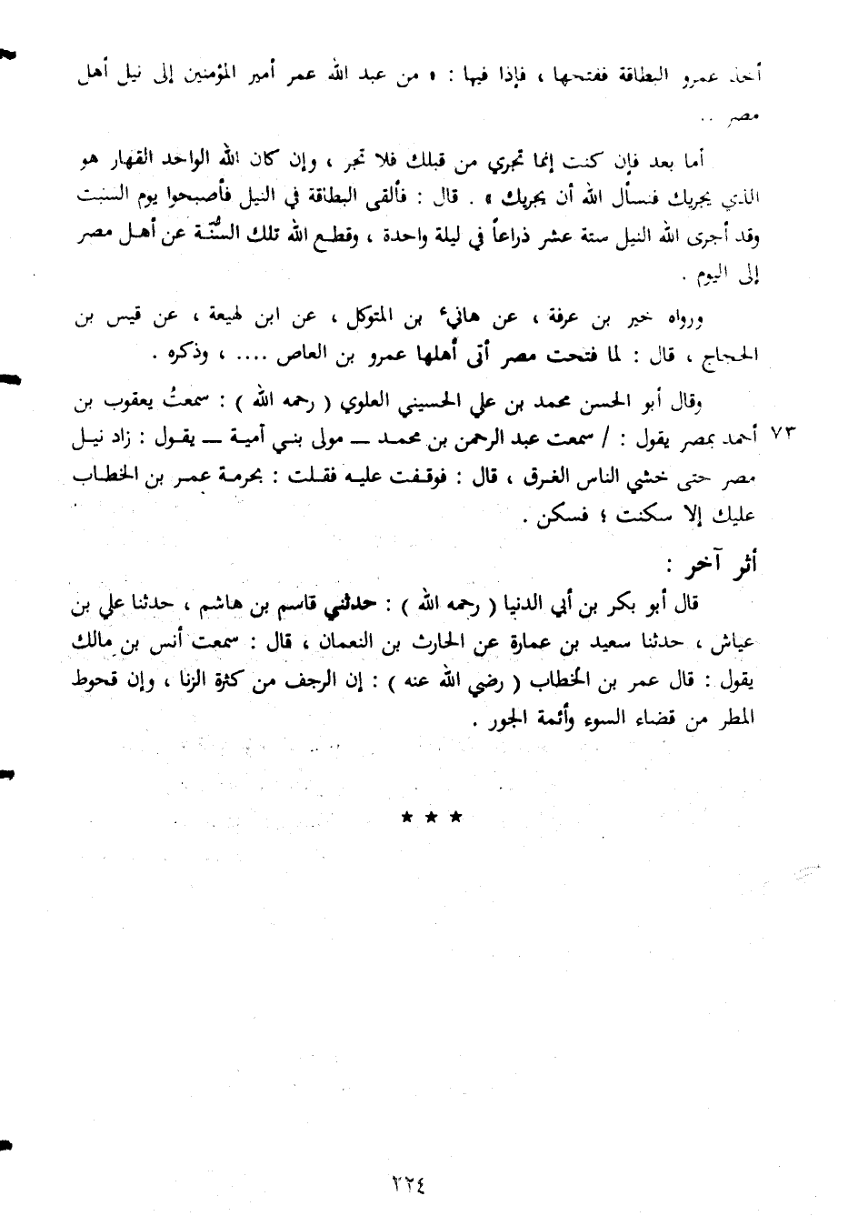 أخذ عمرو البطاقة ففتحها فإذا فيها من عبد الله عمر أمير المؤمنين الى نيل أهل مصر اما بعد فإن كنت انما تجرى من قلبك فلا تجر وان كان الله الواحد القهار هو الذى يحريك فسأل الله ان يجريك قال فألقى البطاقة فى النيل فأصبحوا يوم السبت وقد أجرى الله النيل ستة عشر ذراعا فى اليلة واحدة وقطع الله تلك السنة عن أهل مصر الى اليوم ورواه خير بن عرفة عن هانىء بن المتوكل عن ابن لهيعة عن قيس بن الحجاج قال لما فتحت مصر اتى أهلها عمرو بن العاص وذكره وقال أبو الحسن محمد بن على الحسينى العلوى رحمه الله سمعت يعقوب بن أحمد بمصر يقول سمعت عبد الرحمن بن محمد مولى بنى امية يقول زاد نيل مصر حتى خشى الناس الغرق قال فوقفت عليه فقلت بحرمة عمر بن الخطاب عليك الا سكنت فسكن اثر اخر قال ابو بكر بن ابى الدنيا رحكه الله حدثنى قاسم بن هاشم حدثنا على بن عياش حدثنا سعيد بن عمارة عن الحارث بن النعمان قال سمعت أنس بن مالك يقول قال عمر بن الخطاب رضى الله عنه ان الرجف من كثرة الزنا وان قحوط المطر من قضاء السوء وأئمة الجور