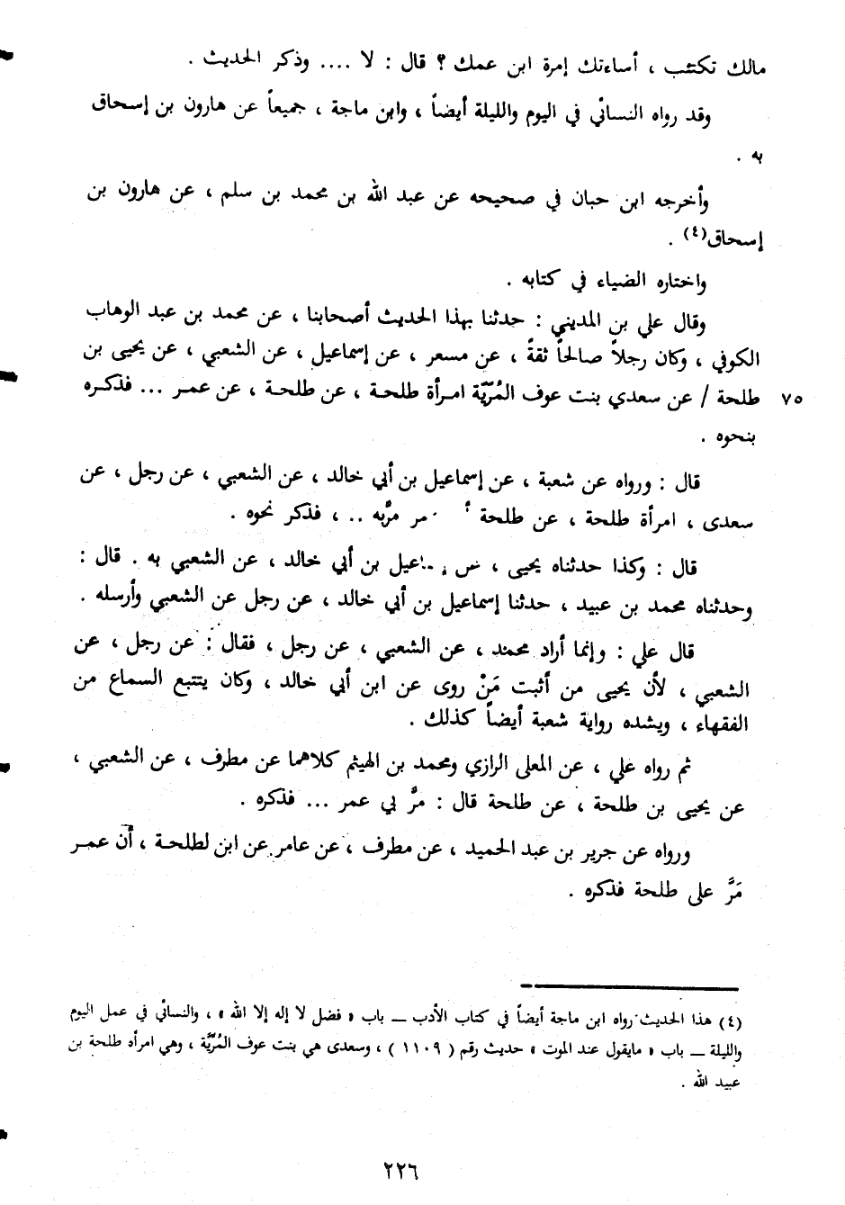 مالك تكثب أساءتك امرة ابن عمك قال لا وذكر الحديث وقد رواه النسائى فى اليوم والليلة ايضا وابن ماجة جميعا عن هارون بن اسحاق به وأخرجه ابن حبان فى صحيحه عن عبد الله بن محمد بن سلم عن هارون بن اسحاق واختاره الضياء فى كتابه وقال على بن المدينى حدثنا بهذا الحديث اصحابنا عن محمد بن عبد الوهاب الكوفى وكان رجلا صالحا ثقة عن مسعر عن اسماعيل عن الشعبى عن يحيى بن طلحة عن سعدى بنت عوف المريه امرأة طلحة عن عمر فذكره بنحوه قال ورواه عن شعبة عن اسماعيل بن ابى خالد عن الشعبى عن رجل عن سعدى امراة طلحة عن طلحة مربه فذكر نحوه قال وكذا حدثناه يحيى عن اسماعيل بن ابى خالد عن الشعبى به قال وجدثناه محمد بن عبيد حدثنا اسماعيل بن ابى خالد عن رجل عن الشعبى وأرسله قال على وانما اراد محمد عن الشعبى لأن يحيى من اثبت من روى عن ابن ابى خالد وكان يتتبع السماع من الفقهاء ويشده رواية شعبه ايضا كذلك ثم رواه على عن المعلى الرازى ومحمد بن الهيثم كلاهما عن مطرف عن الشعبى عن يحيى بن طلحة عن طلحة قال مر بى عمر فذكره ورواه عن جرير بن عبد الحميد عن مطرف عن عامر عن ابن لطلحة ان عمر مر على طلحة فذكره
