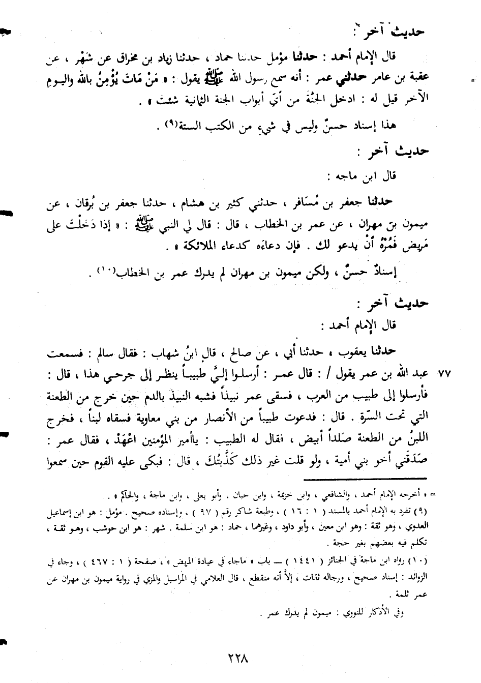 حديث أخر قال الامام احمد حدثنا مؤمل حدثنا حماد حدثنا زياد بن مخراق عن شهر عن عقبة بن عامر حدثنى عمر انه سمع رسول الله صلى الله عليه وسلم يقول من مات يؤمن بالله واليوم الاخر قيل له ادخل الجنة من اى ابواب الجنة الثمانية شئت هذا اسناد حسن وليس فى الشىء من الكتب الستة حديث اخر قال ابن ماجة حدثنا جعفر بن مسافر حدثنى كثير بن هشام حدثنا جعفر بن برقان عن ميمون بن مهران عن عمر بن الخطاب قال قال لى النبى صلى الله عليه وسلم اذا دخلت على مريض فمره ان يدعو لك فإن دعاءه كدعاء الملائكة اسناد حسن ولكن ميمون بن مهران لم يدرك عمر بن الخطاب حديث اخر قال الامام احمد حدثنا يعوب حدثنا ابى عن صالح قال ابن شهاب فقال سالم فسمعت عبد الله بن عمر يقول قال عمر ارسلوا الى طبيبا ينظر الى جرحى هذا قال فأرسل والى الطبيب من العرب فسقى عمر نبيذا فشبه النبيذ بالدم حين خرج من الطعنة التى تحت السرة قالفدعوت طبيبا من الانصار من بنى معاوية فسقاه لينا فخرج اللبن من الطعنة صلدا ابيض فقال له الطبيب يا امير المؤمنين اعهد فقال عمر صدقنى اخو بنى امية ولو قلت غير ذلك كذبتك قال فبكى عليه القوم حين سمعوا