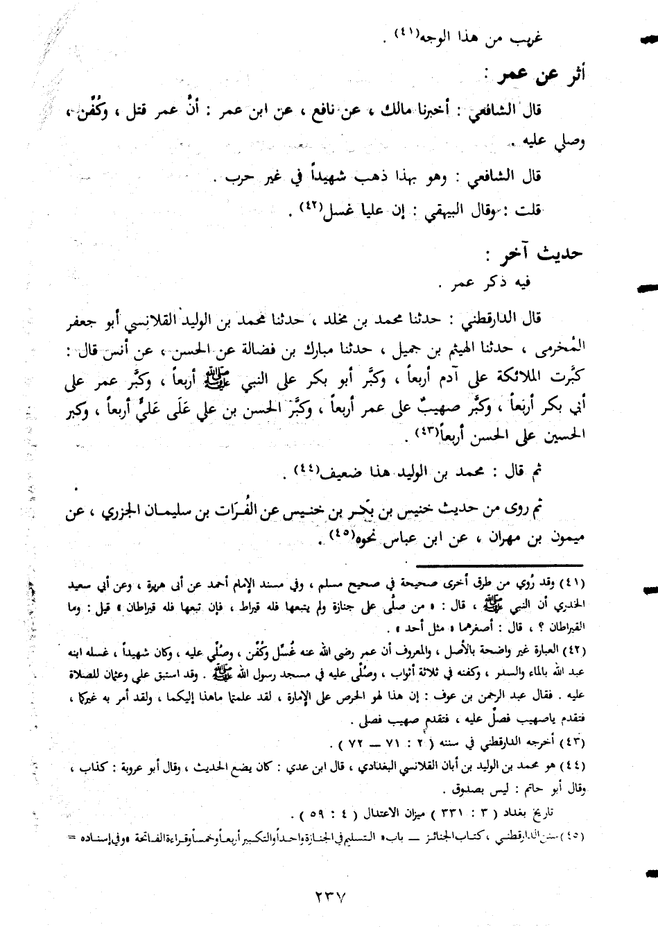 غريب من هذا الوجه اثر عن عمر قال الشافعى اخبرنا مالك عن نافع عن ابن عمر ان عمر قتل وكفن وصلى عليه قال الشافعى وهو بهذا ذهب شهيدا فى غير حرب قلت وقال البيهقى ان عليا غسل حديث اخر فيه ذكر عمر قال الدارقطنى حدثنا محمد بن مخلد حدثنا محمد بن الوليد القلانسى ابو جعفر المخرمى حدثنا الهيثم بن جميل حدثنا مبارك بن فضالة عن الحسن عن انس قال كبرت الملائكة على آدم اربعا وكبر ابو بكر على النبى صلى الله عليه وسلم اربعا وكبر عمر على ابى بكر اربعا وكبر صهيب على عمر اربعا وكبر الحسن بن على على اربعا وكبر الحسين على الحسن اربعا ثم قال محمد بن الوليد هذا ضعيف ثم روى من حديث خنيس عن الفرات بن سليمان الجزرى عن ميمون بن مهران عن ابن عباس نحوه