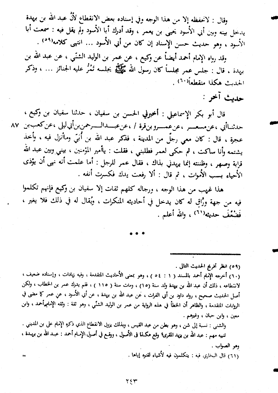 وقال لا تحفظه الا من هذا الوجه وفى اسناده بعض الانقطاع لأن عبد الله بن بريدة يدخل بينه وبين ابى الاسود يحيى بن يعمر وقد ادرك ابا الالسود ولم يقل فيه سمعت ابا الاسود وهو حديث حسن الاسناد ان كان من ابى الاسود انتهى كلامه وقد رواه الامام احمد ايضا عن وكيع عن عمر بن الوليد الشنى عن عبد الله بن بريدة قال جلس عمر مجلسا كان رسول الله صلى الله عليه وسلم يجلسه تمر عليه الجنائز وذكر الحديث هكذا منقطعا حديث أخر قال ابو بكر الاسماعيلى اخبرنى الحسن بن سفيان حدثنا سفيان بن وكيع حدثنا ابى عن مسعر عن عمرو بن قرة عن عبد الرحمن بن ابى ليلى عن كعب بن عجرة قال كان معى رجل من المدينة فذكر عبد الله بن ابى وما أنزل فيه وأخذ يشتمه وانا ساكت ثم حكى لعمر فطلبنى فقلت يا امير المؤمنين بينى وبين عبد الله قرابة وصهر وظننته انما يريدني فقال عمر للرجل اما علمت انه نهى ان يؤذى الاحياء بسب الاموات ثم قال الا رفعت يدك فكسرت انفه هذاغريب من هذا الوجه ورجاله كلهم ثقات الا سفيان بن وكيع فانهم تكلموا فيه من جهة وراق له كان يدخل في احاديثه المنكرات ويقال له في ذلك فلا يغير فضعف حديثه والله اعلم