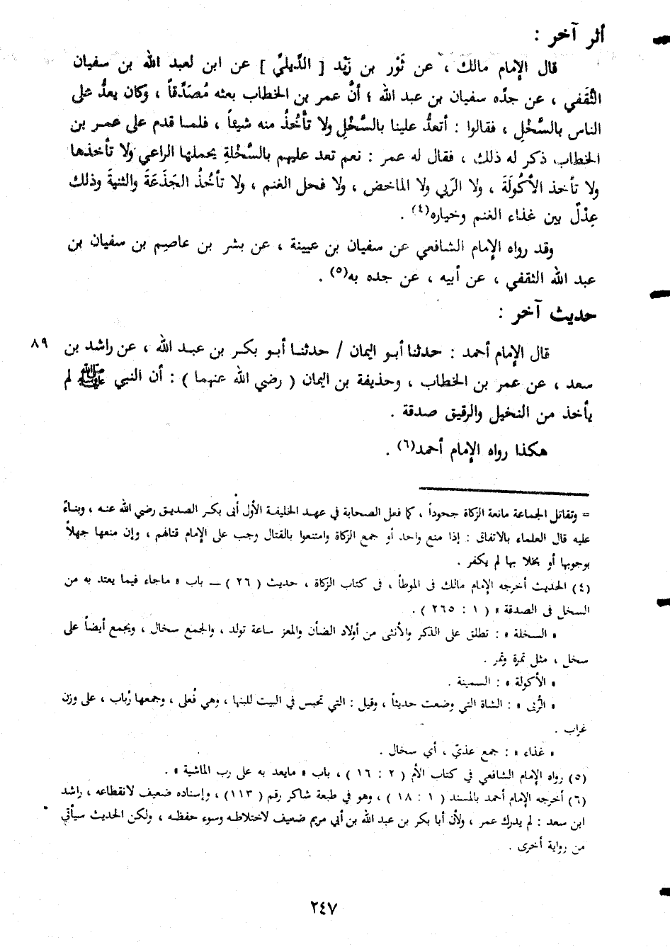 أثر اخر قال الامام مالك عن ثور بن زيد الديلى عن ابن لعبد الله بن سفيان الثقفى عن جده سفيان بن عبد الله ان عمر بن الخطاب بعثه مصدقا وكان يعد على الناس بالسخل فقالوا اتعد علينا بالسخل ولا تأخذ منه شيئا فلما قدم على عمر بن الخطاب ذكر له ذلك فقال له عمر نعم تعد عليهم بالسخلة يحملها الراعى ولا تأخذها وتأخذ الاكولة ولا الربى ولا الماخض ولا فحل الغنم ولا تأخذ الجذعة والثنية وذلك عدل بين غذاء الغنم وخياره وقد رواه الامام الشافعى عن سفيان بن عيينة عن بشر بن عاصم بن سفيان بن عبد الله الثقفى عن ابيه عن جده به حديث اخر قال الامام احمد حدثنا ابو اليمان حدثنا ابو بكر بن عبد الله عن راشد بن سعد عن عمر بن الخطاب وحذيفة بن اليمان رضى الله عنهما ان النبى صلى الله عليه وسلم لم يأخذ من النخيل والرقيق صدقة هكذا رواه الامام أحمد