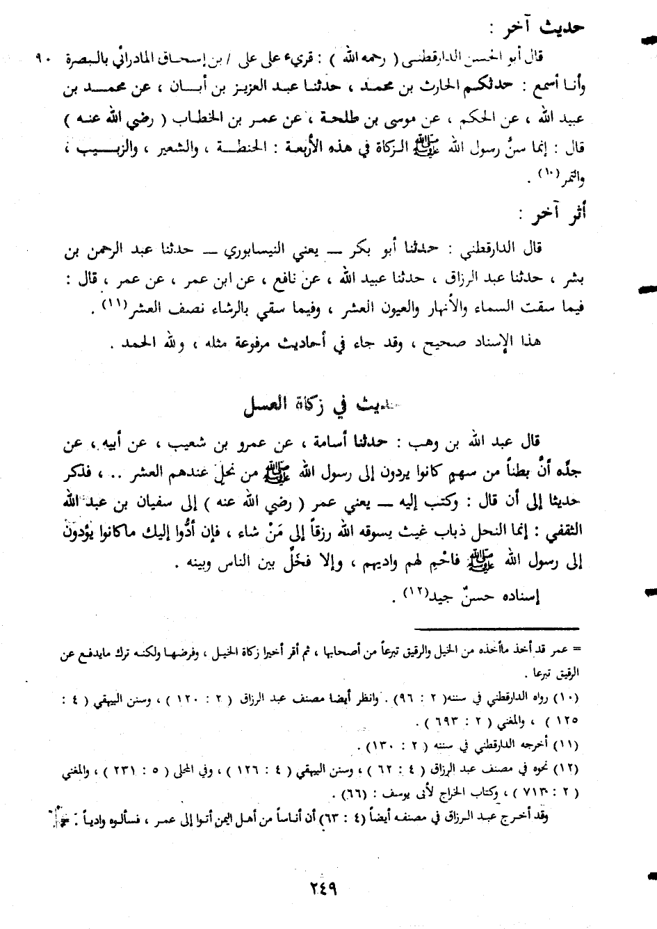 حديثاخر قال ابو الحسن الدارقطنى رحمه الله قرىء على على بن اسحاق رائى بالبصة وانا اسمع حدثكم الحارث بن محمد حدثنا عبد العزيز بن ابان عن محمد بن عبيد الله عن الحكم عن موسى بن طلحة عنم عمر بن الخطاب رضى الله عنه قال انما سن رسول الله صلى الله عليه وسلم الزكاة فى هذاه الاربعة الحنطة والشعير والزبيب والتمر اثر اخر قال الدارقطنى حدثنا ابو بكر يعنى النيسابورى حدثنا عبد الرحمن بن بشر حدثنا عبد الرزاق حدثنا عبيد الله عن نافع عن ابن عمر عنم عمر قال فيما سقت السماء والانهار والعيون العشر وفيما بالرشاء نصف العشر هذاالاسناد صحيح وقد جاء فى احاديث مرفوعة مثله ولله الحمد حديث فى زكاة العسل قال عبد الله بن وهب حدثنا اسامة عن عمرو بن شعيب عن عن ابيه عن جده ان بطامن سهم كانوا يردون الى الرسول الله صلى الله عليه وسلم من نحل عندهم العشر فذكر حديثا الى ان قال وكتب اليه يعنى عمر رضى الله عنه الى سفيان بن عبد الله الثقفى انما النحل ذباب غيث يسوقه الله رزقا الى من شاء فان ادوا اليك ما كانوا يؤدون الى رسول الله صلى الله عليه وسلم فاحم لهم واديهم والا فحل بين الناس وبينه اسناد حسن جيد