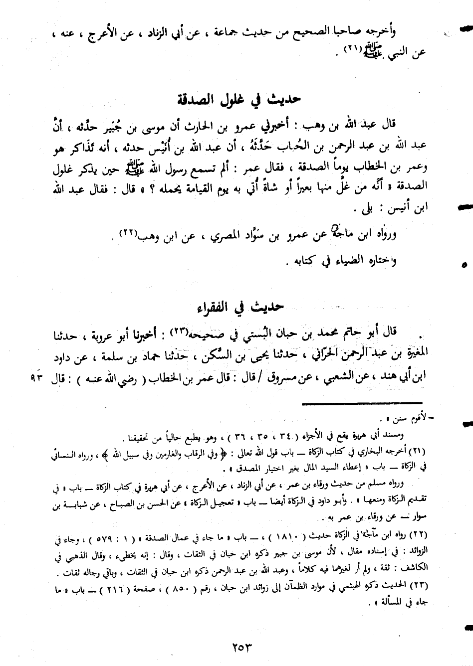 وأخرجه صاحبا الصحيح من حديث جماعة عن ابى الزناد عن الاعرج عنه عن النبى صلى الله عليه وسلم حديث فى غلول الصدقة قال عبد الله بن وهب اخبرنى عمرو بن الحارث ان موسى بن جبير حدثثه ان عبد الله بن عبد الرحمن بن الحباب حدثه ان عبد الله بن عبد الرحمن بن الحباب حدثه ان عبد الله بن انيس حدثه انه تذاكر هو وعمر بن الخطاب يوما الصدقة فقال عمر الم تسمع رسول الله صلى الله عليه وسلم حين يذكر غلول الصدقة انه من غل منها بعيرا او شاة اتى به يوم القيامة يحمله قال فقال عبد الله ابن انيس بلى ورواه ابن ماجة عن عمرو بن سواد المصرى عن ابن وهب واختاره الضياء فى كتابه حديث فى الفقراء قال ابو حاتم محمد بن حبان البستى فى صحيحه اخبرنا ابو عروبه حدثنا المغيرة بن عبد الرحمن الحرانى حدثنا يحيى بن السكن حدثنا حماد بن سلمة عن داود ابن ابى هند عن الشعبى عن مسروق قال قال عمر بن الخطاب رضى الله عنه قال