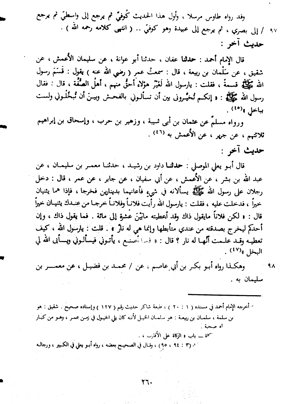 وقد رواه طاوس مرسلا واول هذا الحديث كوفى ثم يرجع الى واسطى ثم يرجع الى بصرى ثم يرجع الى عبيدة وهو كوفى انتهى كلامه رحمه الله حديث اخر قال الامام احمد حدثنا عفان حدثنا ابو عوانة عن سليمان الاعمش عن شقيق عن سليمان بن ربيعة قال سمعت عمر رضى الله عنه يقول قسم رسول الله صلى الله عليه وسلم قسمة فقلت يا رسول الله لغير هؤلاء احق منهم اهل الصفة قال فقال رسول الله صلى الله عليه وسلم انكم تخيرونى بين ان تسألونى بالفحش وبين ان تبخلونى ولست بباخل ورواه مسلم عن عثمان بن ابى شبيبة وزهير بن حرب واسحاق بن ابراهيم ثلاثتهم عن جرير عن الاعمش به حديث اخر قال ابو يعلى الموصلى حدثنا داود بن رشيد حدثنا معمر بن سليمان عن عبد الله بن بشر عن الاعمش عن ابى سفيان عن جابر عن عمر قال دخل رجلان على رسول الله صلى الله عليه وسلم يسألانه فى شىء فأعانهما بدينارين فخرجا فاذا هما يثنيان خيرا فدخلت عليه فقلت يا رسول الله رأيت فلانا وفلانا خرجا من عندك يثنان خيرا قال لكن فلانا ما يقول ذاك وقد أعطيته ما بين عشرة الى مائة فما يقول ذاك وان احدكم ليخرج بصدقتة من عندى متأبطها وانما هى له نار قلت يا رسول الله كيف تعطيه وقد علمت انها له نار قال فما اصنع يأتونى فيسألونى ويأتى الله لى البخل وهكذا رواه ابو بكر بن ابى عاصم عن محمد بن فضيل عن معمر بن سليمان به