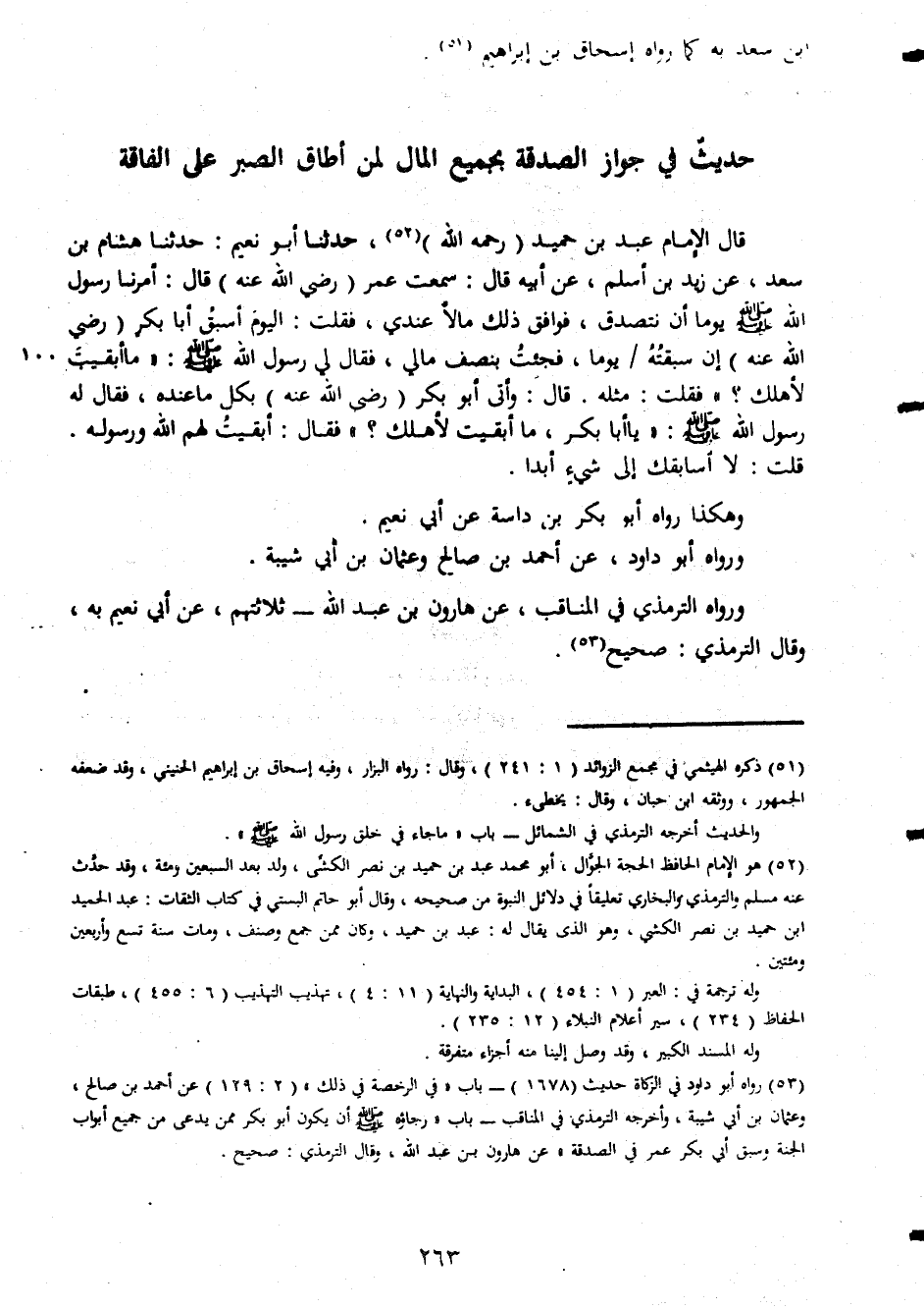 ابن سعد به كمان رواه اسحاق بن ابراهيم حديث فى جةاز الصدقة بجميع المال لمن أطاق الصبر على الفاقة قال الامام عبد بن حميد رحمه الله حدثنا ابو نعيم حدثنا هشام بن سعد عن زيد بن اسلم عن ابيه قال سمعت عمر رضى الله عنه قال امرنا رسول الله صلى الله عليه وسلم يوما ان نتصدق فوافق ذلك مالا عندى فقلت اليوم اسبق ابا بكر رضى الله عنه ان سبقته يوما فجئت بنصف مالى فقال لى رسول الله صلى الله عليه وسلم ما ابقيت رسول الله صلى الله عليه وسلم يا ابا بكر ما ابقيت لأهلك فقال ابقيت لهم الله ورسوله قلت لا أسابقك الى شىء ابدا وهكذا رواه ابو بكر بن دراسة عن ابى نعيم ورواه ابو داود عن احمد بن صالح وعثمان بن ابى شيبة ورواه الترمذى فى المناقب عن هارون بن عبد الله ثلاثتهم عن ابى نعيم به وقال الترمذى صحيح