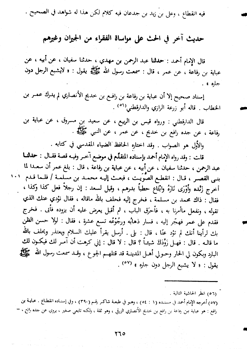 فيه انقطاع وعلى بن زيد بن جدعان فيه كلام لكن هذا له شواهد فى الصحيح حديث اخر فى الحث على مواساة الفقراء من الجيران وغيرهم قال الامام احمد حدثنا عبد الرحمن بن مهدى حدثنا سفيان عن ابيه عن عباية بن رفاعة عن عمر قال سمعت رسول الله صلى الله عليه وسلم يقول لا يشبع الرجل دون جاره اسناد صحيح الا ان عباية بن رفاعة بن رافع بن خديج الانصارى لم يدرك عمر بن الخطاب قاله ابو زرعة الرازى والداراقطنى قال الدارقطنى ورواه قيس بن الربيع عن سعيد بن مسروق عن عباية بن رفاعة عن جدة رافع بن خديج عن عمر عن النبى صلى الله عليه وسلم والاول هو الصواب وقد اختاره الحافظ الضياء المقدسى فى كتابه قلت وقد رواه الامام احمد بإسناده المتقدم فى موضع اخر وفيه فقال حدثنا عبد الرحمن حدثنا سفيان عن ابيه عن عباية بن رفاعة قال بلغ عمر ان سعدا لما بنى القصر قال انقطع الصويت فبعث اليه محمد بن مسلمة فلما قدم اخرج زندة واروى ناره واتباع حطبا بدرهم وقيل لسعد ان رجلا فعل ككذا وكذا فقال ذاك محمد بن مسلمة فخرج اليه فحلف بالله ماقاله فقال نؤدى عنك الذى تقوله ونفعل ما امرنا به فأحرق الباب قم اقبل يعرض عليه ان يزوده فأبى فخرج فقدم على عمر فهجر اليه فسار ذهابه ورجوعه تسع عشرة فقال لولا حسن الظن بك لرأينا انك لم تؤدعنا قال بلى ارسل يقرأ عليك السلام ويعتذر ويحلف بالله ما قاله قال فهل زودك شيئا قال لا قال انى كرهت ان امر لك فيكون لك البارد ويكون لى الحار وحولى اهل المدينة قد قتلهم الجوع وقد سمعت رسول الله صلى الله عليه وسلم يقول لا يشبع الرجل دون جاره