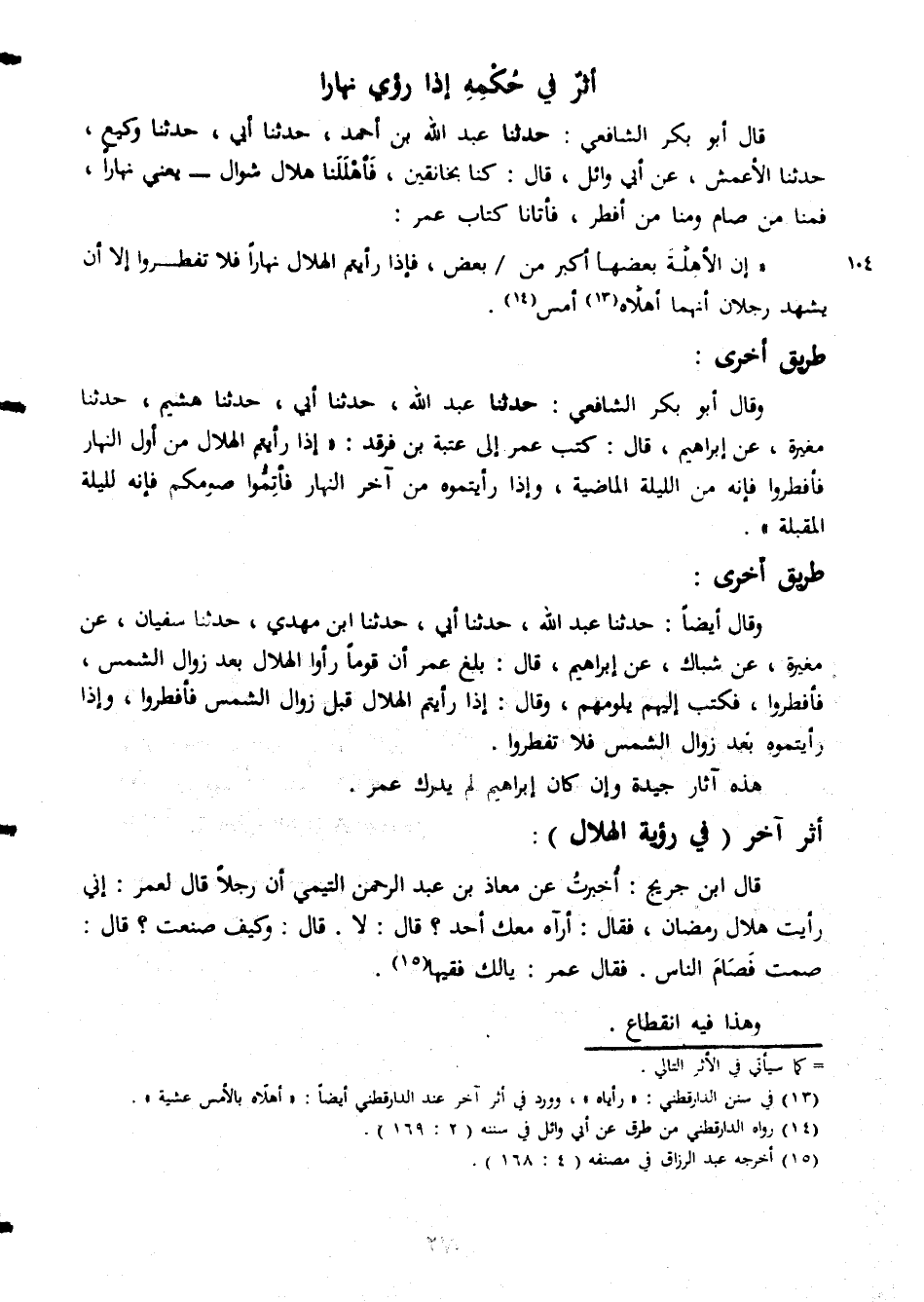 أثر فى حكمه اذا رؤى نهارا قال ابو بكر الشافعى حدثنا عبد الله بن احمد حدثنا ابى حدثنا وكيع حدثنا الاعمش عن ابى وائل قال كنا بخانقين فأهللنا هلال شوال يعنى نهارا فمنا من صام ومنا من افطر فأتانا كتاب عمر ان الاهلة بعضها اكبر من بعض فإذا رأيتم الهلال نهارا فلا تفطروا الا ان يشهد رجلان انهما اهلاه امس طريق اخرى وقال ابو بكر الشافعى حدثنا عبد الله حدثنا ابى حدثنا هشيم حدثنا مغيرة عن ابراهيم قال كتب عمر الى عتبة بن فرقد اذا رأيتم الهلال من اول النهار فأفطروا فإنه من الليلة الماضية واذا رأيتموه من اخر النهار فأتموا صومكم فإنه لليلة المقبلة طريق اخرى وقال ايضا حدثنا عبد الله حدثنا ابن مهدى حدثنا سفيان عن مغيرة عن شباك عن ابراهيم قال بلغ عمر ان قوما رأوا الهلال بعد زوال الشمس فأفطروا فكتب اليهم يلومهم وقال اذا رأيتم الهلال قبل زوال الشمس فأفطروا واذا رأيتموه بعد زوال الشمس فلا تفطروا هذه آثار جيدة وان كان ابراهيم لم يدرك عمر أثر آخر فى رؤية الهلال قال ابن جريج اخبرت عن معاذ بن عبد الرحمن التيمى ان رجلا قال لعمر انى رأيت هلال رمضان فقال اراه معك أحد قال لا قال وكيف صنعت قال صمت فصام الناس فقال عمر يالك فقيها وهذا فيه انقطاع