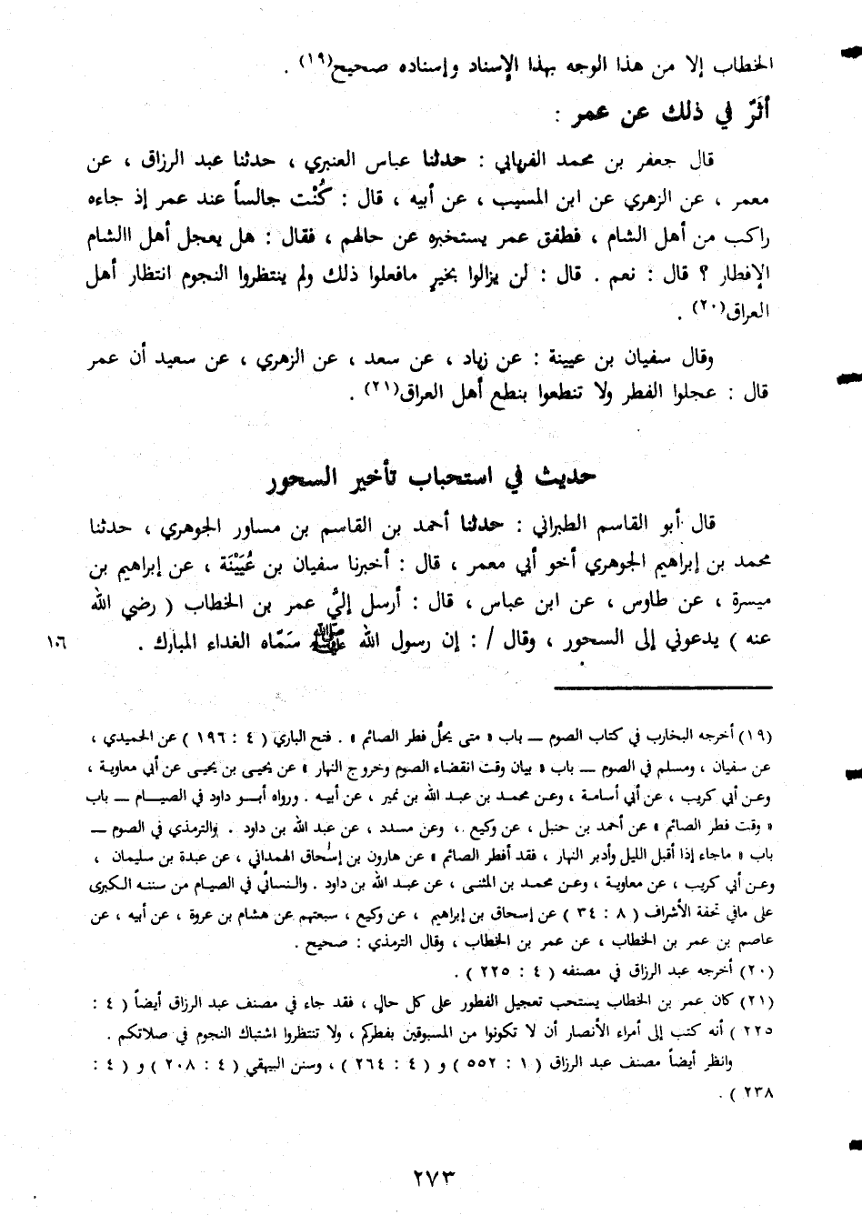 الخطاب الا من هذا الوجه بهذا الاسناد واسناده صحيح أثر فى ذلك عن عمر قال جعفر بن محمد الفريابى حدثنا عباس العنبرى حدثنا عبد الرزاق عن معمر عن الزهرى عن ابن المسيب عن ابيه قال كنت جالسا عند عمر اذ جاءه راكب من اهل الشام فطفق عمر يستخبره عن حالهم فقال هل يعجل اهل الشام الافطار قال نعم قال لن يزالو بخير ما فعلوا ذلك ولم ينتظروا النجومانتظار أهل العراق وقال سفيان بن عيينة عن زياد عن سعد عن الزهرى عن سعيد ان عمر قال عجلوا الفطر ولا تنطعوا بنطع أهل العراق حديث فى استجاب تأخير السحور قال ابو القاسم الطبرانى حدثنا احمد بن القاسم بن مساور الجوهرى حدثنا محمد بن ابراهيم الجوهرى اخو ابى معمر قال اخبرنا سفيان بن عيينة عن ابراهيم بن ميسرة عن طاوس عن ابن عباس قال أرسل الى عمر بن الخطاب رضى الله عنه يدعونى الى السحور وقال ان رسول الله صلى الله عليه وسلم سماه الغداء المبارك