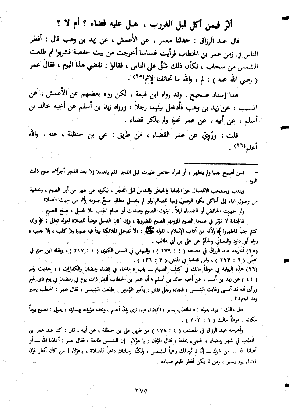 أثر فيمن اكل قبل الغروب هل عليه قضاء ام لا قال عبد الرزاق حدثنا معمر عن الاعمش عن زيد بن وهب قال أفطر الناس فى زمن عمر بن الخطاب فرأيت غساسا أخرجت من بيت حفصة فشربوا ثم طلعت الشمس من سحاب فكأن ذلك شق على الناس فقالوا نقضى هذا اليوم فقال عمر رضى الله عنه لم والله ما تجانفنا لإثم هذا اسناد صحيح وقد رواه ابن لهيعة لكن رواه بعضهم عن الاعمش عن المسيب عن زيد بن وهب فأدخل بينهما رجلا ورواه زيد بن اسلم عن اخيه خالد بن اسلم عن ابيه عن عمر نحوه ولم يذكر قضاء قلت وروى عن عمر القضاء من طريق على بن حنظلة عنه والله أعلم