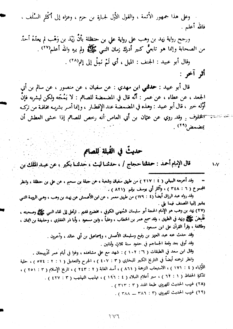 وعلى هذا جمهور الائمة والقول الاول الجبارة بن حزم وعراة الى اكثر السلف فالله اعلم ورجح رواية زيد بن وهب على رواية على بن حنظلة بأن زيد بن وهب لم يعده احد من الصحابة وانما هو تابعى كبير ادرك زمان النبى صلى الله عليه وسلم ولم يره والله اعلم وقال ابو عبيد الجنف الميل اى لم تمل الى اثم اثر اخر قال ابو عبيد حدثنى ابن مهدى عن سفيان عن منصور عن سالم بن ابى الجعد عن عطاء عن عمر انه قال فى المضمضة للصائم لا يمجه ولكن ليشربه فان اوله خير قال ابو عبيد وهذه فى المضمضة عند الافطار وانما امر بشريه مخافة من تركه الخلوف وقد روى عن عثمان بن ابى العاص انه رخص للصائم اذا خشى العطش ان يمضمض حديث فى القبلة للصائم قال الامام احمد حدثنا حجاج حدثنا ليث حدثنا بكير عن عبد الملك بن