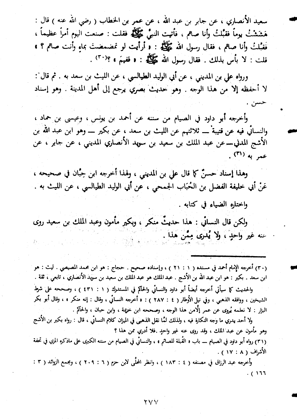 سيعد الانصارى عن جابر بن عبد الله عن عمر بن الخطاب رضى الله عنه قال هششت يوما فقبلت وانا صائم فأتيت النبى صلى الله عليه وسلم فقلت صنعت اليوم امرا عظيما فقبلت وانا صائم فقال رسول الله صلى الله عليه وسلم ارايت لو تمضمضت بماء وانت صائم قلت لا بأس بذلك فقال رسول الله صلى الله وسلم ففيم ورواه على بن المدينى عن ابى الوليد الطيالسى عن الليث بن سعد به ثم قال لا أحفظه الا من هذا الوجه وهو حديث بصرى يرجع الى اهل المدينة وهو اسناد حسن واخرجه ابو داود فى الصيام من سننه عن احمد بن يونس وعيسى بن حماد والنسائى فيه عن قتيبة ثلاثتهم عن الليث بن سعد عن بكير وهو ابن عبد الله بن الاشج المدنى عن عبد الملك بن سعيد بن سويد الانصارى المدينى عن جابر عن عمر به وهذا اسناد حسن كما قال على بن المدينى ولهذا اخرجه ابن حبان فى صحيحه عن ابى خليفة الفضل بن الحبان الجمحى عن ابى الوليد الطيالسى عن الليث به واختاره الضياء فى كتابه ولكن قال النسائى هذا حديث منكر وبكير مأمةن وعبد الملك بن سعيد روى عنه غير واحد ولا يدرى ممن هذا
