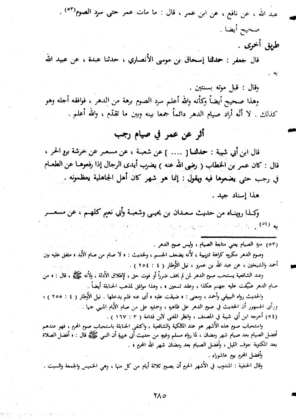 عبد الله عن نافع عن ابن عمر قال ما مات عمر حتى سرد الصوم صحيح ايضا طريق اخرى قال جعفر حدثنا اسحاق بن موسى الانصارى حدثنا عبدة عن عبيد الله به وقال قبل موته بسنتين وهذا صحيح ايضا وكأنه والله أعلم سرد الصوم برهة من الدهر فوافقه اجله وهو كذلك لا انه لواد صيام الدهر دائما جمعا بينه وبين ما تقدم والله اعلم أثر ابن ابى شبيبة حدثنا عن شعبة عن مسعر عن خرشة بن الحر قال كان عمر بن الخطاب رضى الله عنه يضرب ايدى الرجال اذا رفعوها عن الطعام فى رجب حتى يضعوها فيه ويقول انما هو شهر كان اهل الجاهلية يعظمونه هذا اسناد جيد وكذا رويناه من حديث سعدان بن يحيى وشعبة وابى نعيم كلهم عن مسعر به