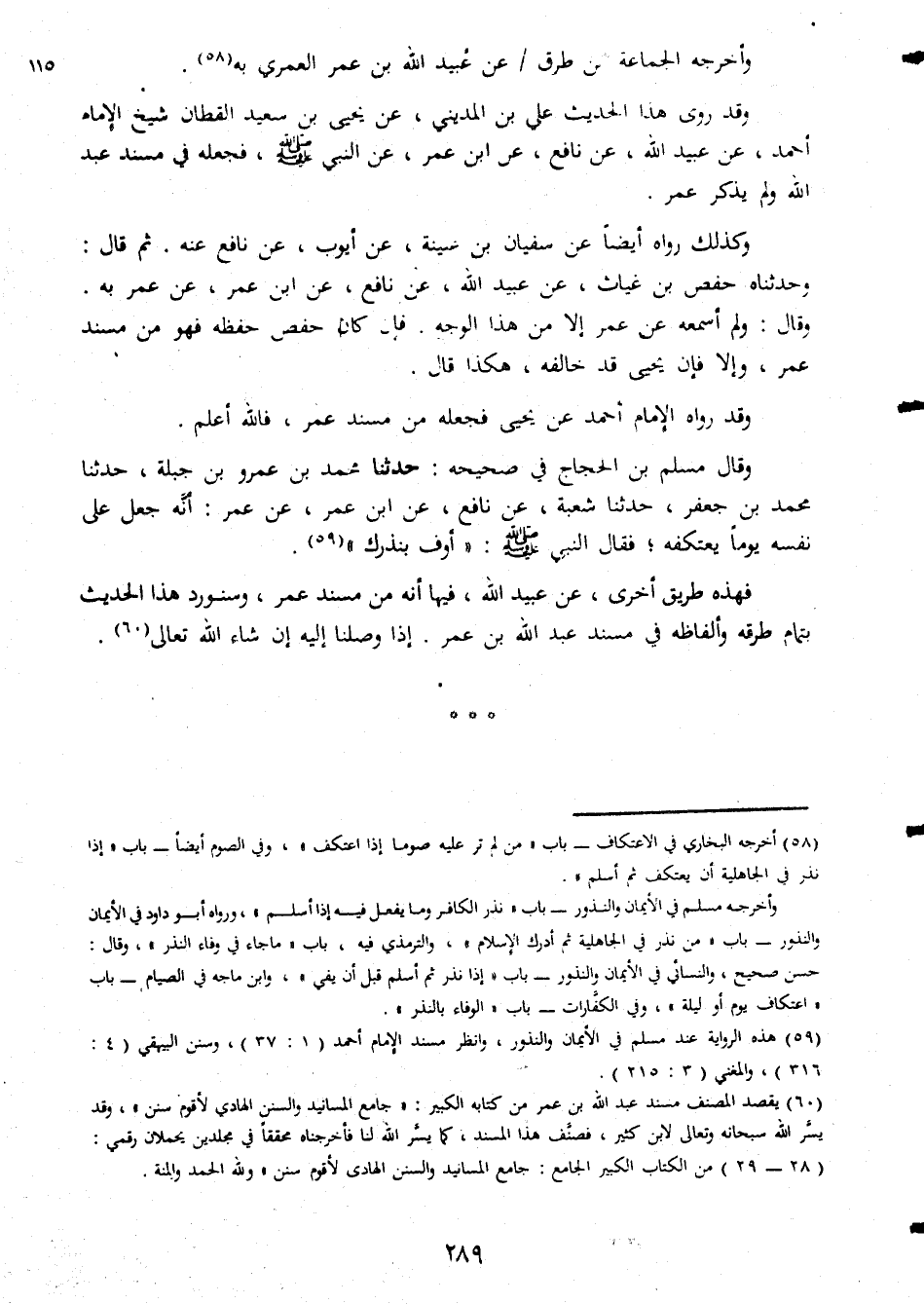 وأخرجه الجماعة من طرق عن عبيد الله بن عمر العمرى به وقد روى هذا الحديث على بن المدينى عن يحيى بن سعيد القطان شيخ الامام احمد عن عبيد الله عن نافع عن ابن عمر عن النبى صلى الله عليه وسلم فجعله فى مسند عبد الله ولم يذكر عمر وكذلك رواه ايضاعن سفيان بن عيينة عن ايوب عن نافع عنه ثم قال وحدثناه حفص بن غياث عن عبيد الله عن نافع عن ابن عمر عن عمر به وقال ولم اسمعه عن عمر الا من هذا الوجه فإن كان حفص حفظه فهو من مسند عمر والا فإن يحيى قد خالفه هكذا قال وقد رواه الامام احمد عن يحيى فجعله من مسند عمر فالله أعلم وقال مسلم بن الحجاج فى صحيحه حدثنا محمد بن همرو بن جبلة حدثنا محمد بن جعفر حدثنا شعبة عن نافع عن ابن عمر عن عمر انه جعل على نفسه يوما يعتكفه فقال النبى صلى الله عليه وسلم اوف بنذرك فهذه طريق اخرى عن عبيد الله فيما انه من مسند عمر وسنورد هذا الحديث يتمام طرقه وألفاظه فى مسند عبد الله بن عمر اذا وصلنا اليه انم شاء الله تعالى