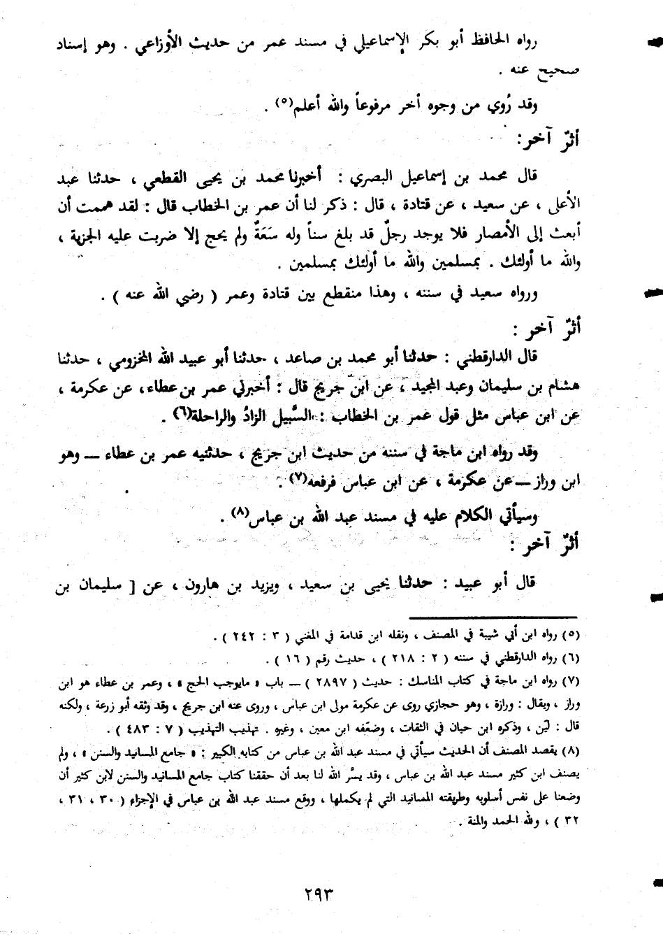 رواه الحافظ ابو بكر الاسماعيلى فى مسند عمر من حديث الاوزاعى وهو اسناد صحيح عنه وقد روى من وجوه آخر مرفوعا والله أعلم أثر آخر قال محمد بن اسماعيل البصرى أخبرنا محمد بن يحيى القطعى حدثنا عبد الاعلى عن سعيدعن قتادة قال ذكر لنا ان عمر بن الخطاب قال لقد هممت أن أبعث الى الامصار فلا يوجد رجل قد بلغ سنا وله سعة ولم يحج الا ضربت عليه الجزية والله ما أولئك بمسلمين والله ما أولئك بمسلمين ورواه سعيد فى سننه وهذا منقطع بين قتادة وعمر رضى الله عنه أثر اخر قال الدارقطنى حدثنا ابو محمد بن صاعدة حدثنا ابو عبيد الله المخزومى حدثنا هشام بن سليمان وعبد المجيد عن ابن جريح قال أخبرنى عمر بن عطاء عن عكرمة عن ابن عباس مثل قول قول عمر بن الخطاب السنبيل الزاد والراحلة وقد رواه ابن ماجة فى سننه من حديث ابن جريح حدثنيه عمر بن عطاء وهو ابن وراز عن عكرمة عن ابن عباس فرقعه وسيأتى الكلام عليه فى مسند عبد الله بن عباس أثر أخر قال ابو عب حدثنا يحيى بن سعيد ويزيد بن هارون عن سليمان بن