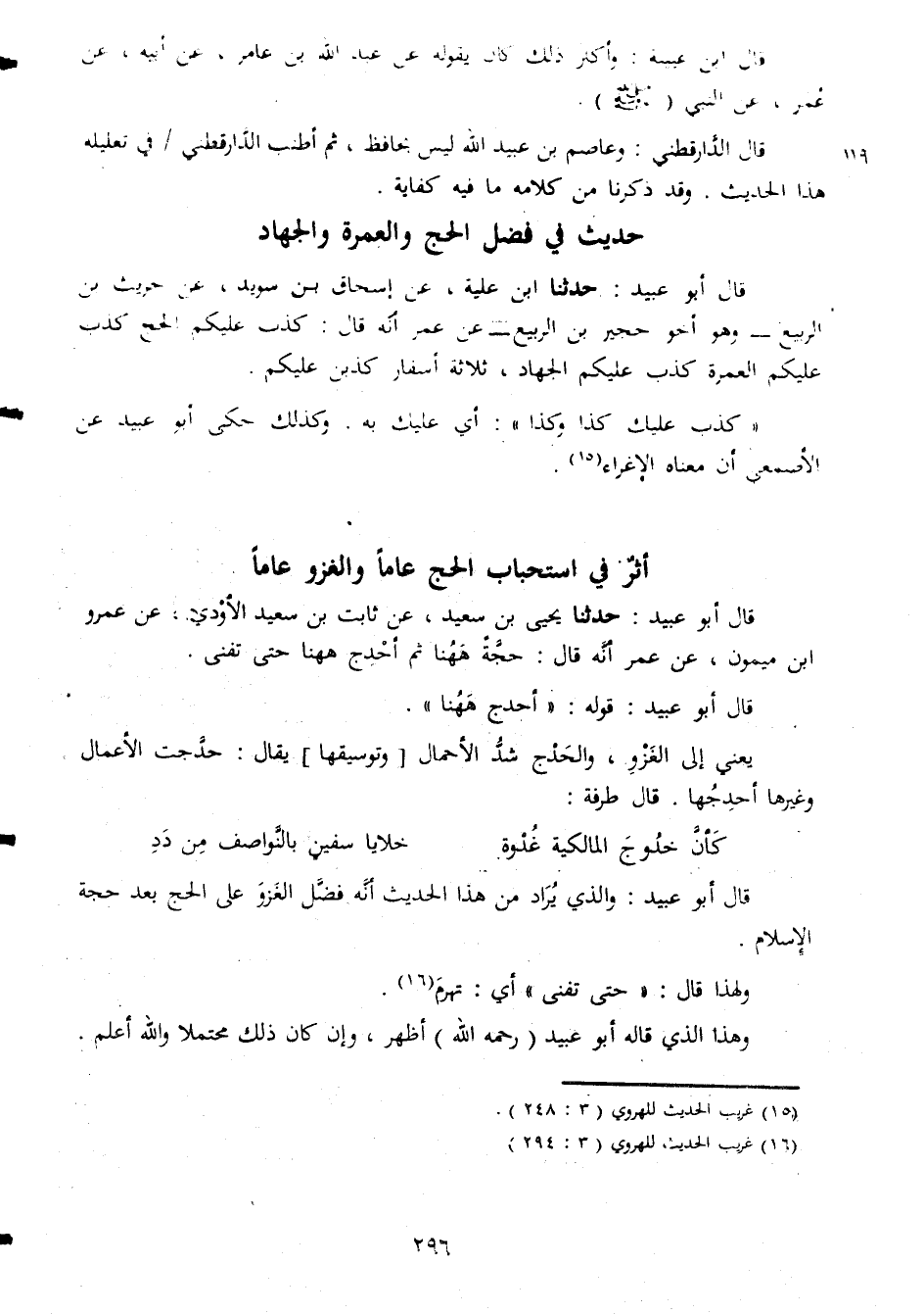 قال ابن عيينة واكثر ذلك كان يقوله عن عبد الله بن عامر عن ابيه عن عمر عن النبى صلى الله عليه وسلم قال الدارقطنى وعاصم بن عبيد الله ليس بحافظ ثم أطنب الدارقطنى فى تعليله هذا الحديث وقد ذكرنا من كلامه ما فيه كفاية حديث فى فضل الحج والعمرة والجهاد قال ابو عبيد حدثنا ابن علية عن اسحاق بن سويد عن حريث بن الربيع وهو أخو حجير بن الربيع عن عمر انه قال كذب عليكم الحج كذب عليكم العمرة عليكم الجهاد ثلاثة اسفار كذبن عليكم كذب عليك كذا وكذا اى عليك به وكذلك حكى ابو عبيد عن الاصمعى ان معناه الاغراء أثر فى استجاب الحج عاما والغزو عاما قال ابو عبيدحدثنا يحيى بن سعيد عن ثابت بن سعيد الاودى عن عمرو ابن ميمون عن عمر انه قال حجة ههنا ثم أحدج شد الاحمال وتوسيقها يقال خدجت الأعمال وغيرها أحدجها قال طرفة كان خدوج المالكية غدوة خلايا سفين بالنواصف من ددقال أبو عبيد والذي يراد من هذا الحديث أنه فضل العزو على الحج بعد حجة الإسلام ولهذا قال حتى تفنى أي تهرم وهذا الذى قاله أبو عبيد رحمه الله أظهر وإن كان ذلك محتملا والله أعلم