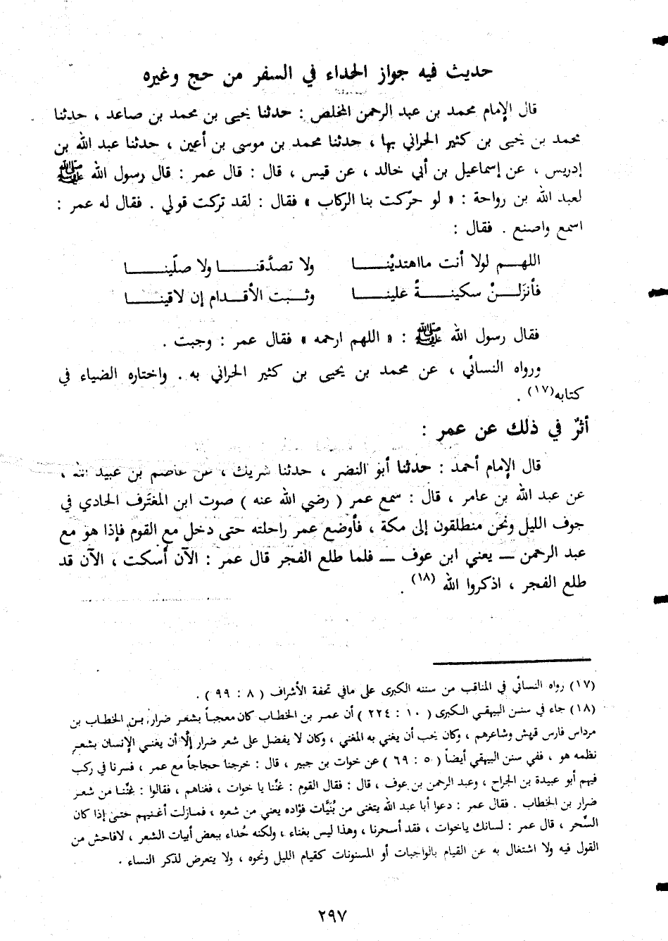 حديث فيه جواز الحداء فى السفر من حج وغيره قال الإمام محمد بن عبد الرحمن المخلص حدثنا يحيى بن محمد بن صاعد حدثنا عبد الله بن إدريس عن إسماعيل بن أبي خالد عن قيس قال قال عمر قال رسول الله صلى الله عليه وسلم لعبد الله بن رواحة لو حركت بنا الركاب فقال لقد تركت قولى فقال له عمر اسمع واصنع فقال اللهم لولا انت ما اهتدينا ولا تصدقنا ولا صلينا فأنزلن سكينة علينا وثبت الأقدام إن لاقينا فقال رسول الله صلى الله عليه وسلم اللهم ارحمه فقال عمر وجبت ورواه النسائي عنمحمد بن يحيى بن كثير الحراني به واختاره الضياء في كتابة أثر في ذلك عن عمر قال الإمام حدثنا ابو النصر حدثنا شريك عن عاصم بن عبيد الله عن عبد الله بن عامرقال سمع عمر رضى الله عنه صوت ابن المغترف الحادى فى جوف الليل ونحن منطلقون الى مكة فافضع عمر راحلته حتى دخل مع القوم فغذا هو مع عبد الرحمن يعنى ابن عوف فلما طلع الفجر قال عمر الان اسكت الان قد طلع الفجر اذكروا الله