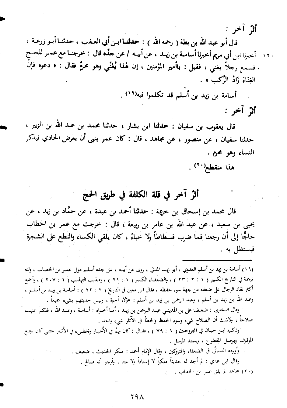 اثر اخر قال ابوعبد الله بن بطة رحمه الله حدثنا ابن ابى العقب حدثنا ابو زرعة اخبرنا ابن ابى مريم اخبرنا اسامة بن زيد عن ابيه عن جده قال خرجنا مع عمر للحج فسمع رجلا يغنى فقيل يا امير المؤمنين ان لهذا يغنى وهو محرم فقال دعوة فان الغناء زاد الركب أسامة بن زيد بن اسلم قد تكاموا فيه اثر اخرقال يعقوب بن سفيان حدثنا محمدابن بشاربن عبد الله بنالزبير حدثنا سفيان عن منصور عن مجاهد قالكان عمر ينهى أن ي عرض الحادى فيذكرالنساء وهو محرم هذا منقطع أثر أخر في قلة الكلفة في طريق الحج قال محمد بن إسحاق بن خزيمة حدثنا أحمد بن عبدة عن حماد بن زيد عن يحيى بن سعيد عن عبد الله بن عامربن ربيعة قال خرجت مع عمر بن الخطاب حاجا الى أن رجعنا فما ضرب فسطاطا ولا خباء كان ياقي الكساء والنطع عاى الشجرة فيستظل به