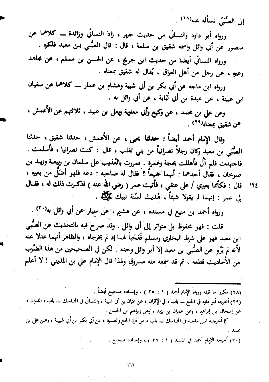 الى الصبى نسأله عنه ورواه ابو داود والنسائى من حديث جرير زاد النسائى وزائدة كلاهما عن منصور عن ابى وائل واسمه شقيق بن سلمة قال قال الصبى بن معبد فذكره ورواه النسائى ايضا من حديث ابن جريح عن الحسن بن مسلم عن مجاهد وغيره عن رجل من اهل العراق يقال له شقيق بمعناه ورواه ابن ماجة عن ابى بكر بن ابى بكر بن ابى شيبة وهشام بن عمار كلاهما عن سفيان ابن عيينة عن عبدة بن ابى لبابة عن ابى وائل به وعن على بن محمد عن وكيع وابى معاوية ويعلى بن عبيد ثلاثهم عن الأعمش عن شقيق بمعناه وقال الامام احمد ايضا حدثنا يحيى عن الاعمش حدثنا شقيق حدثنا الصبى بن معبد وكان رجلا نصرانيا من بنى تغلب قال كنت نصرانيا فأسلمت فاجتهدت فلم آل فاهللت بحجة وعمرة فمرت بالعذيب على سلمان بن ربيعة وزيد بن صوخان فقال أحدهما أبهما جميعا فقال له صاحبه دعه فلهو أضل بعيره قال فكأنما بعيري على عنقي فأتيت عمر رضى الله عنه فذكرت ذلك له فقال لي عمر إنها لم يقول شيئا هديت لسنة نبيك صلى الله عليه وسلم ورواه أحمد بن منيع فىمسنده عن هشيم عن سيار عن أبي وائل به قلت فهو محفوظ بل متواتر إلى أبي وائل وقد صرح فيه بالتحديث عن الصبي ابن معبد فهوعلى شرط البخاري ومسلم فعجبا لهماإذ لم يخرجاه والظاهر أنهما عدلا عنه لأنه لم يرو عن الصبى بن معبد الا ابو وائل وحده لكن فى الصحيحين من هذا الضرب من الاحاديث قطعة ثم قد سمعه منه مسروق ولهذا قال الامام على بن المدينى لا اعلم