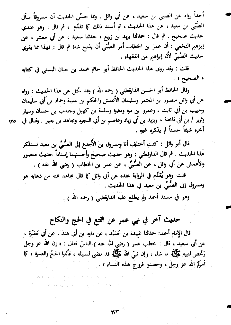 احدا رواه عن الصبى بن سعيد عن ابى وائل ومما حسن الحديث ان مسروقا سأل الصبى بن معبد عن هذا الحديث ثم اسند ذلك كما تقدم ثم قال وهو عندى حديث صحيح ثم قال حدثنا يزيد بن زريع حدثنا سعيد عن ابى معشر عن ابراهيم النخعى ان عمر بن الخطاب امرالصبى ان يذبح ساة ثم قال فهذا ممايقوى حديث الصبى لان ابراهيم من الفقهاء قلت وقد روى هذا الحديث الحافظ ابو حاتم محمد بن حبان البستى فى كتابه الصحيح وقال الحافظ ابو الحسن الدارقطنى رحمه الله وقد سئل عن هذا الحديث رواه عن ابى وائل منصوربن المعتمر وسليمان الاعمش والحكم بن عتيبة وحماد بن ابى سليمان وحبيب بن ابى ثابت وعمرو بن مغيرة وسلمة بن كهيل وجندب بن حسان وسيار وثوير بن ابى فاختة ويزيد بن ابى زياد وعاصم بن ابى النجود ومجاهد بن جبير وقال فى اخره شيئا حسنا لم يذكره غيره قال ابو وائل كنت اختلف انا ومسروق بن الاجدع الى الصبى بن معبد نستدكر هذا الحديث ثم قال الدارقطنى وهوحديث صحيح واحسنها اسنادا حديث منصور الاعمش عن ابى وائل عنابى وائل عن الصبى عن عمر بن الخطاب رضى الله وهو يقدمفى الرواية عنده عن ابى وائل كما قال مجاهد عنه من ذهابه هو مسروق الى الصبى بن معبد فى هذا الحديث وهو فى مسند احمد ولم يطلع عليه الدارقطنى رحمه الله حديث اخر فى نهى عمر عن التمتع فى الحج والنكح قال الامام احمد حدثنا عبيدة بن حميد عن داود بن ابى هند عن ابى نضرة عن ابى سعيد قال خطب عمر رضى الله عنه الناس فقال ان الله عز وجل رخص لنبيه صلى الله عليه وسلم قد مضى لسبيله فاتموالحج والعمرة كما امركم الله عز وجلوحصنوا فروج هذه النساء
