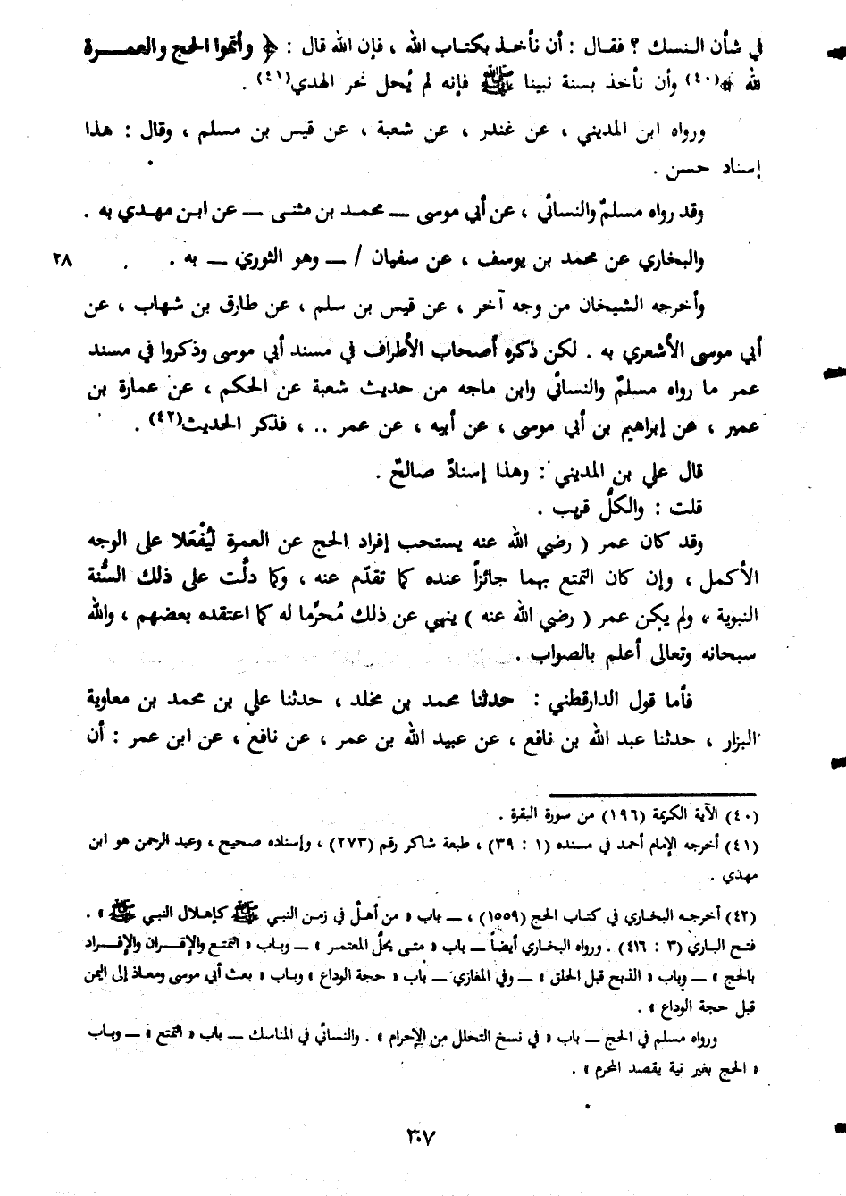 فى شك النسك فقال اتأخذ بكتاب الله فإن الله قال واتموا الحج والعمرة لله وان نأخذ بسنة نبينا صلى الله عليه وسلم فإنه لم يحل نحر الهدى ورواه مسلم والنسائى عن ابى موسى محمد بن مثنى عن ابن مهدى به والبخارى عن محمد بن يوسف عن سفيان وهو الثورى به واخرجه الشيخان من وجه آخر عن قيس بن مسلم عن طارق بن شهاب عن ابى موسى الاشعرى به لكن ذكره اصحاب الاطراف فى مسند عمر ما رواه مسلم النسائى وابن ماجة من حديث شعبة عن الحكم عن عمارة بن عمير عن ابراهيم بن ابى موسى عن ابيه عن عمر فذكر الحديث قال على بن المدينى وهذا اسناد صالح قلت والكل قريب وقد كان عمر رضى الله عنه يستجب افراد الحج عن العمرة ليفعلا على الوجه الاكمل وان كان التمتع بهما جائزا عنده كما تقدم عنه وكما دلت على ذلك السنة النبوية ولم يكن عمر رضى الله عنه ينهى عن ذلك محرما له كما اعتقده بعضعهم والله سبحانه وتعالى اعلم بالصواب فأما سقول الدارقطنى حدثنا محمد بن مخلد حدثنا على بن محمد بن معاوية البزار حدثنا عبد الله بن نافع عن عبيد الله بن عمر عن نافع عن ابن عمر ان